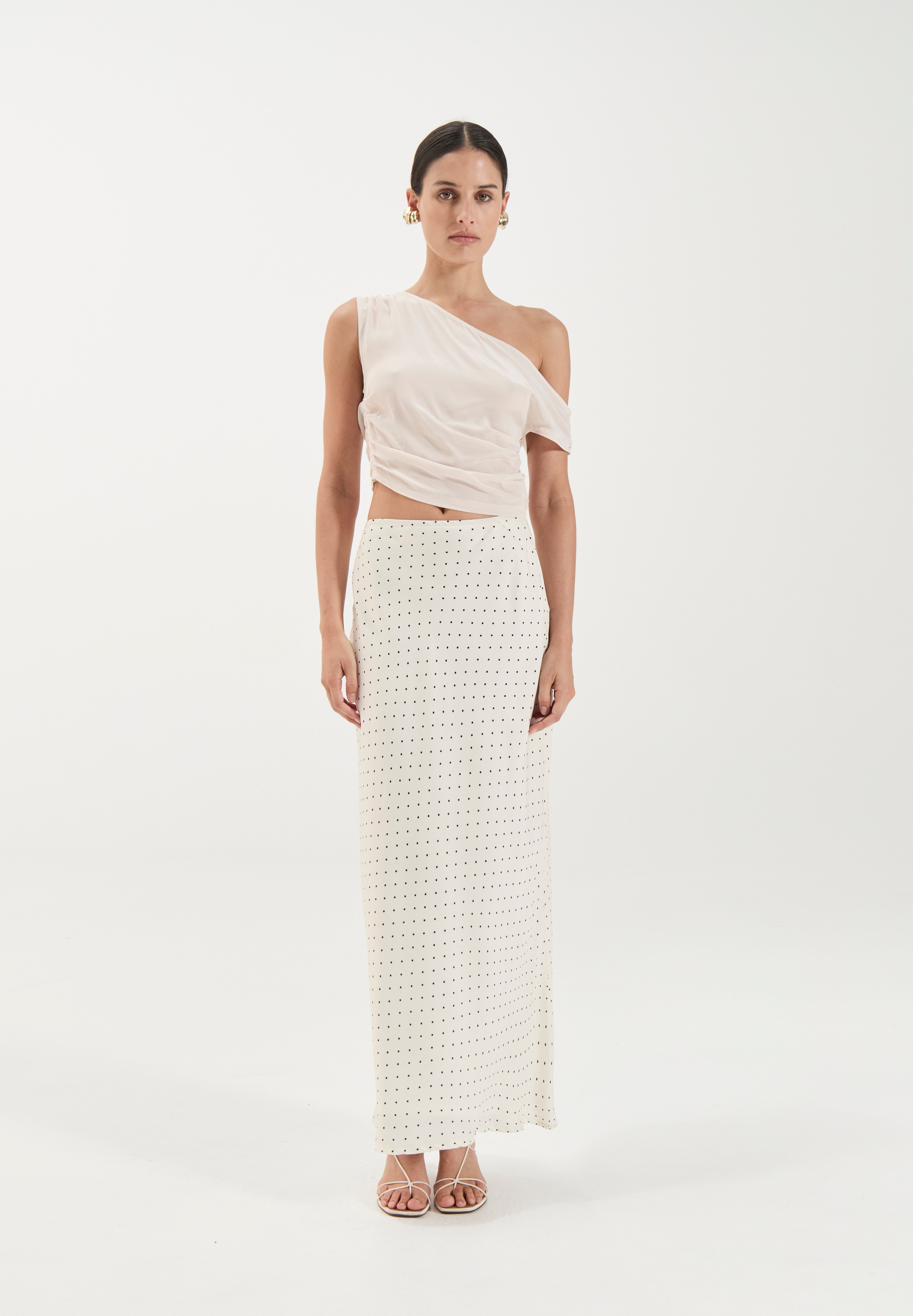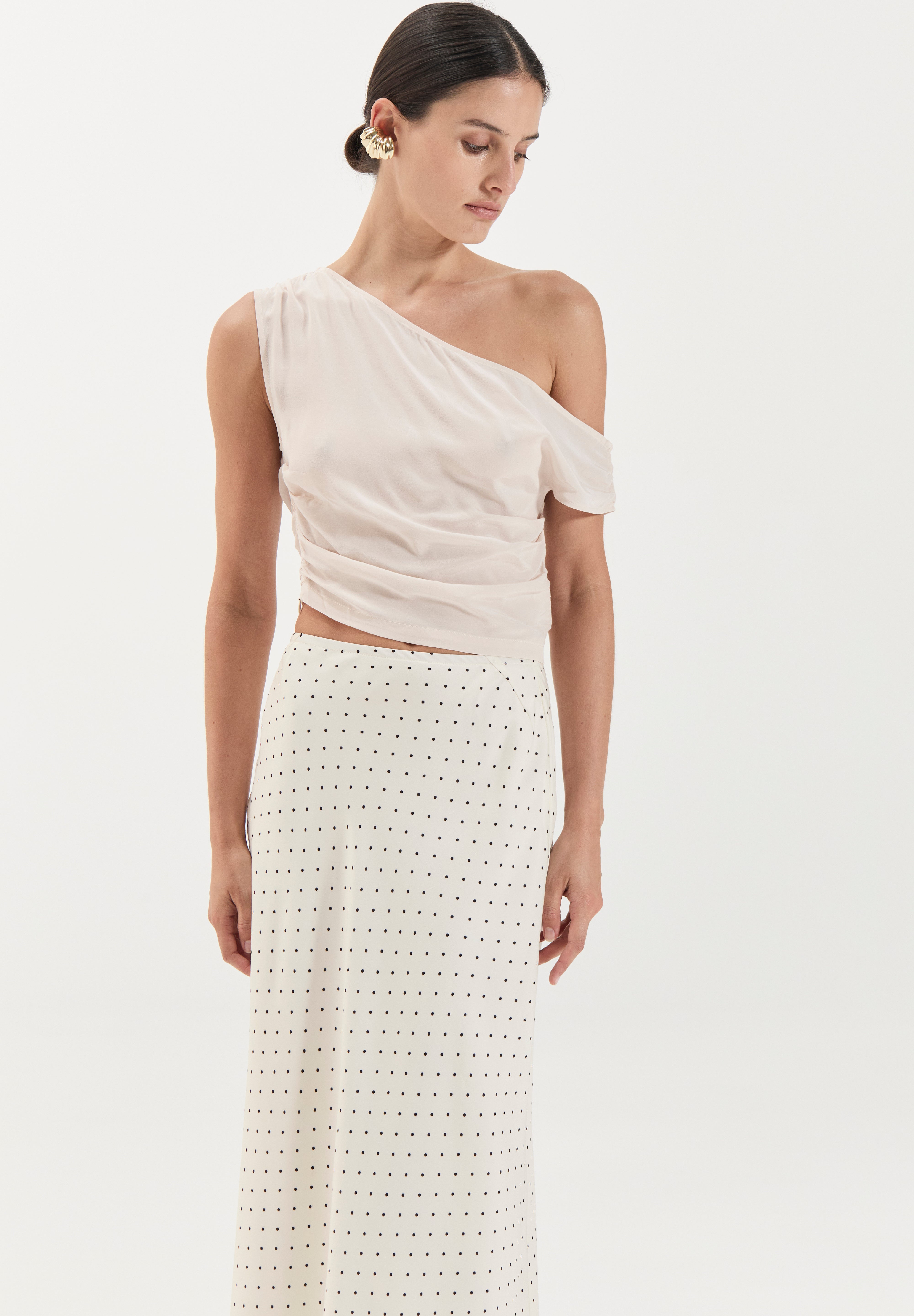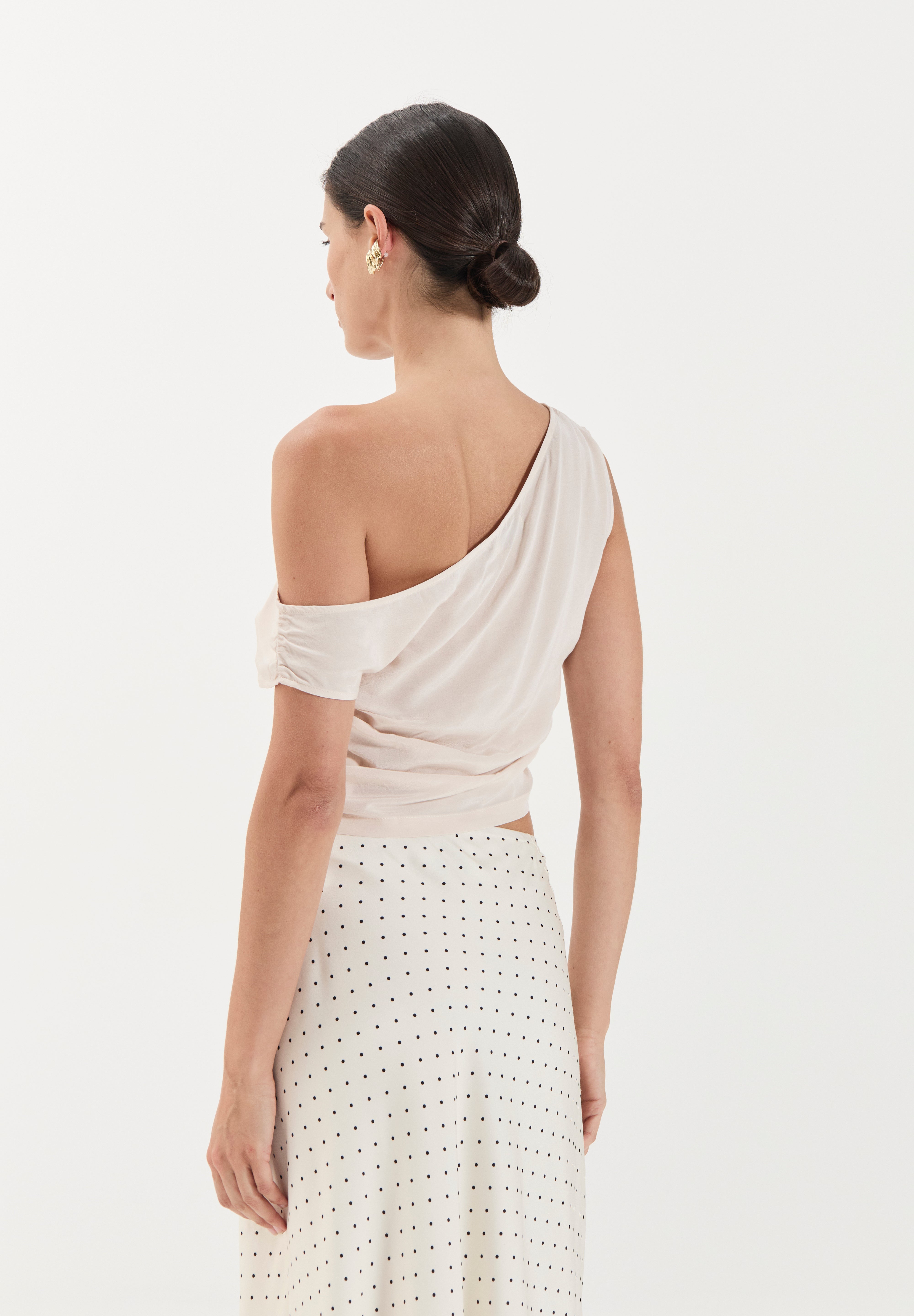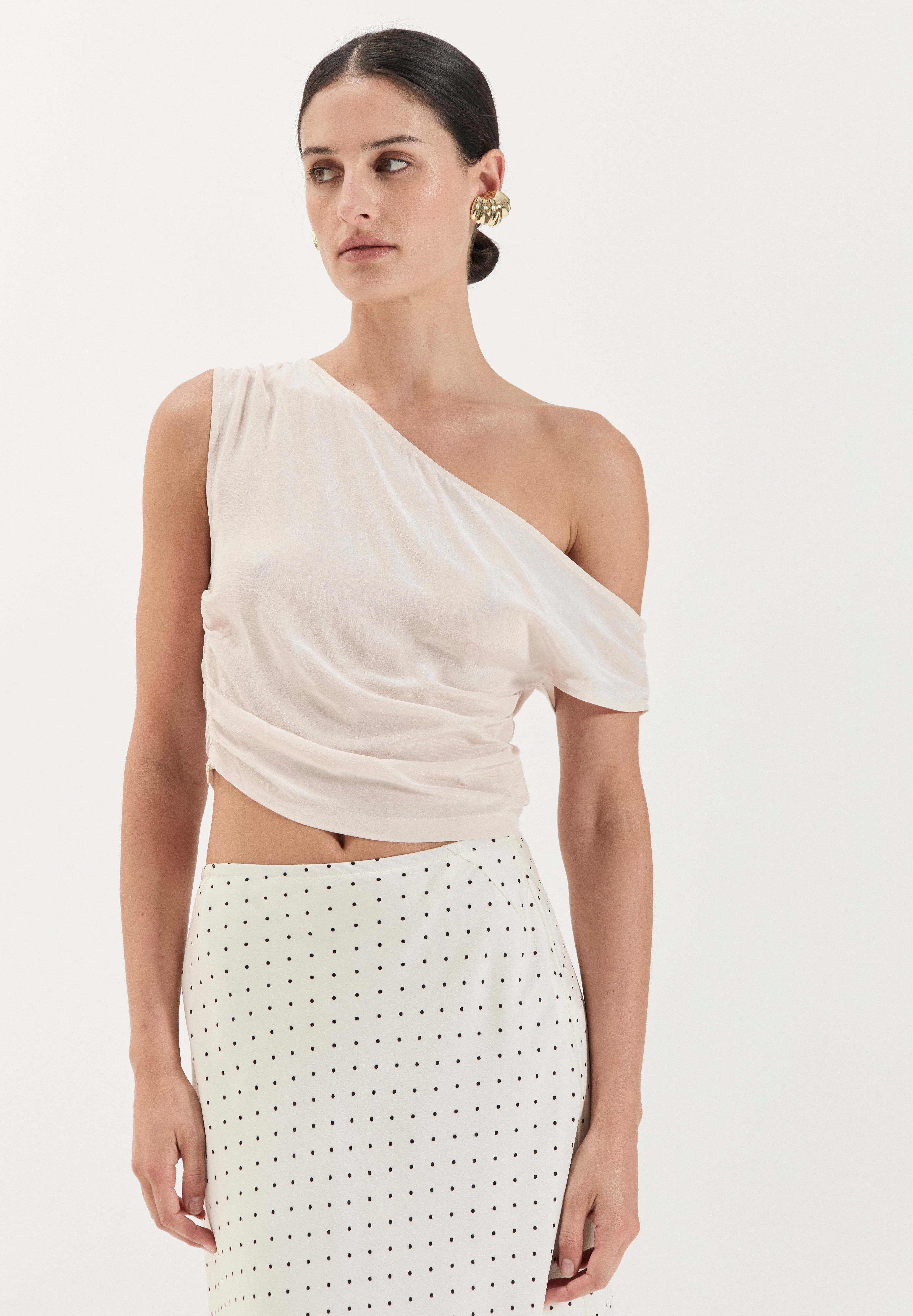 Indulge in luxury with the Genevieve Top. The off shoulder design adds a touch of sensuality, while the asymmetric cut and gathering on each side create an elegant silhouette. The draping detail adds a hint of drama, making this top perfect for any upscale occasion. This item is unlined.