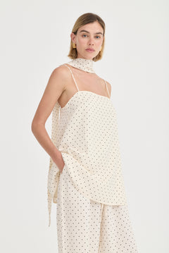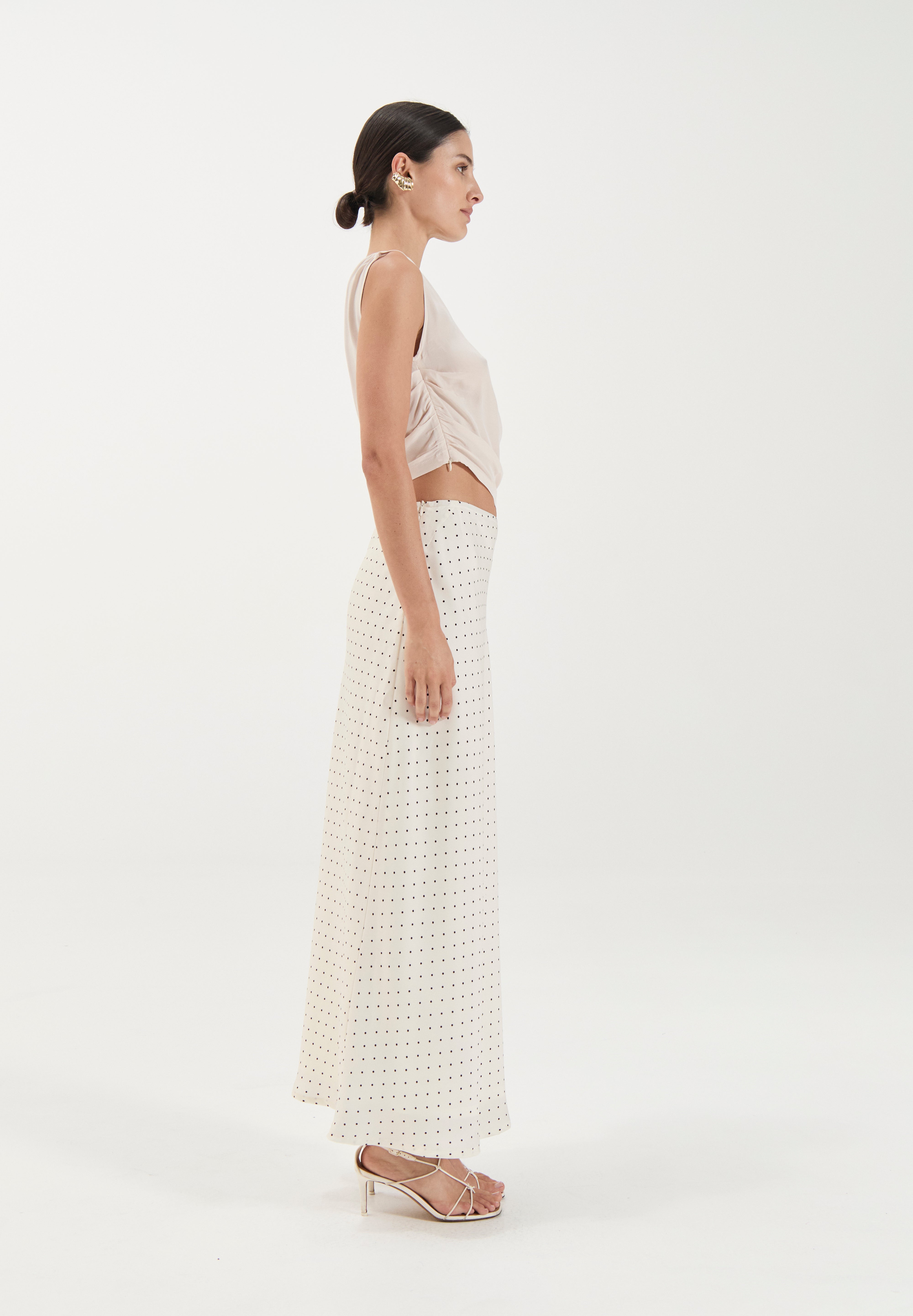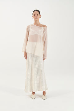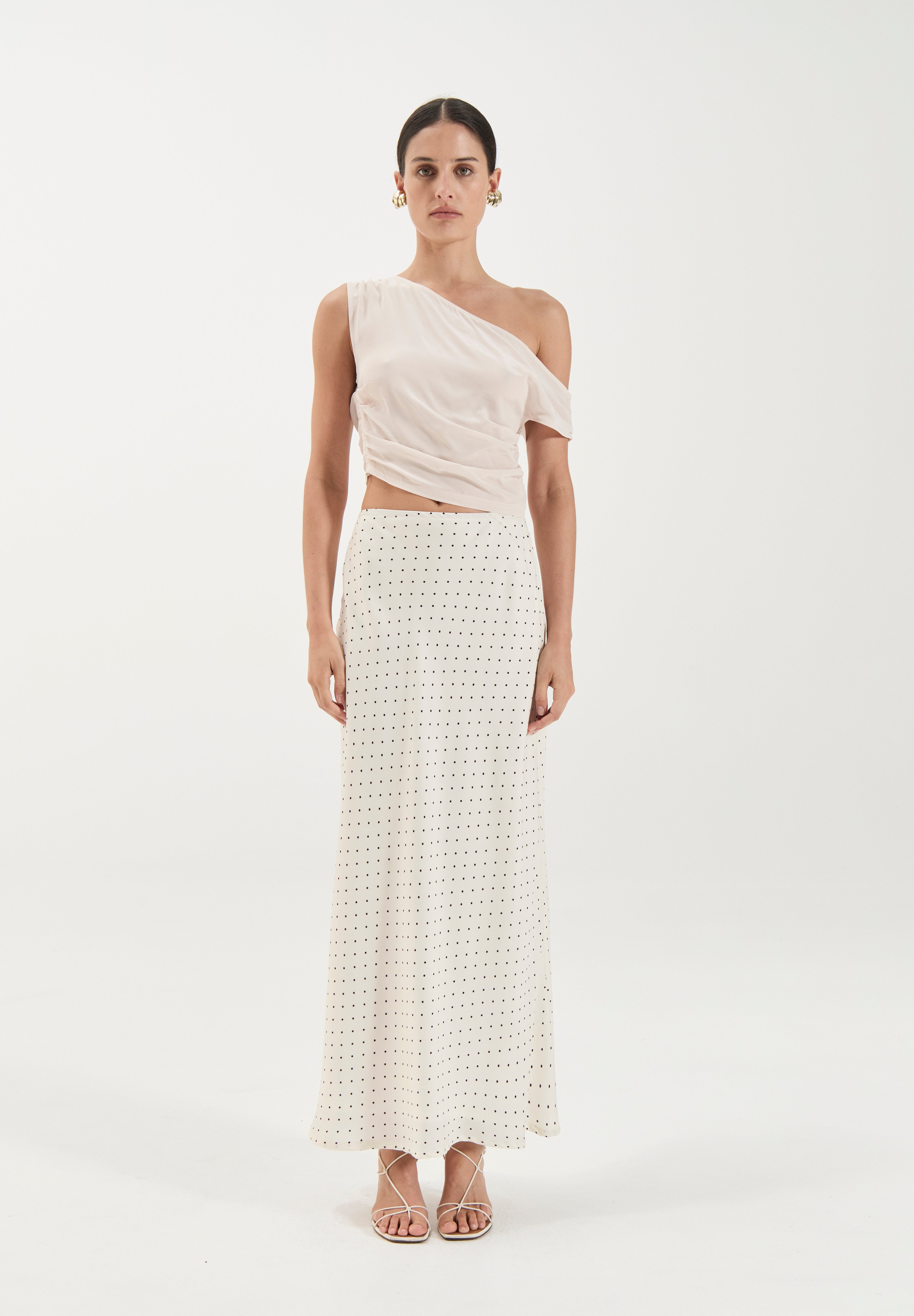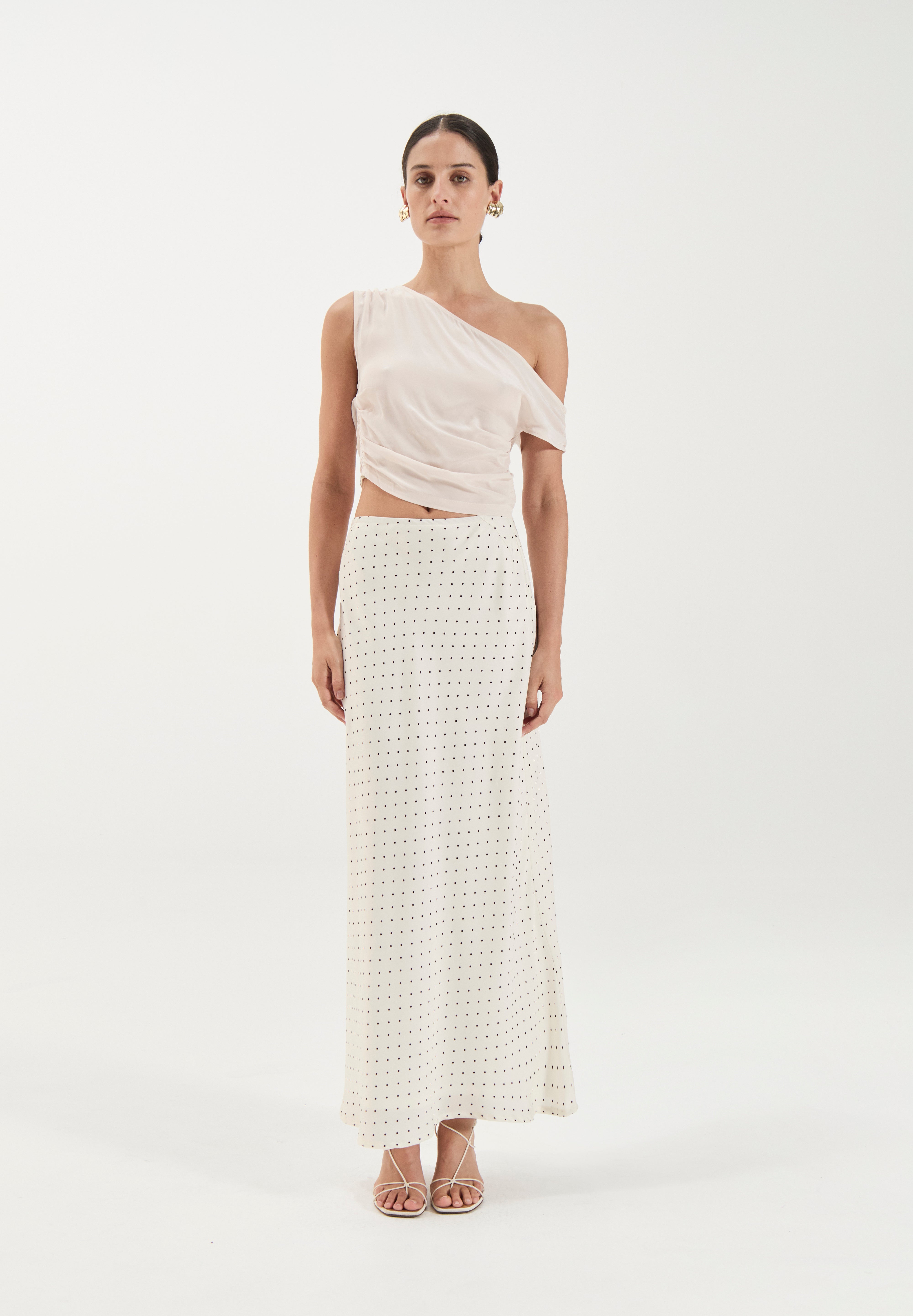 Indulge in luxury with the Genevieve Top. The off shoulder design adds a touch of sensuality, while the asymmetric cut and gathering on each side create an elegant silhouette. The draping detail adds a hint of drama, making this top perfect for any upscale occasion. This item is unlined.