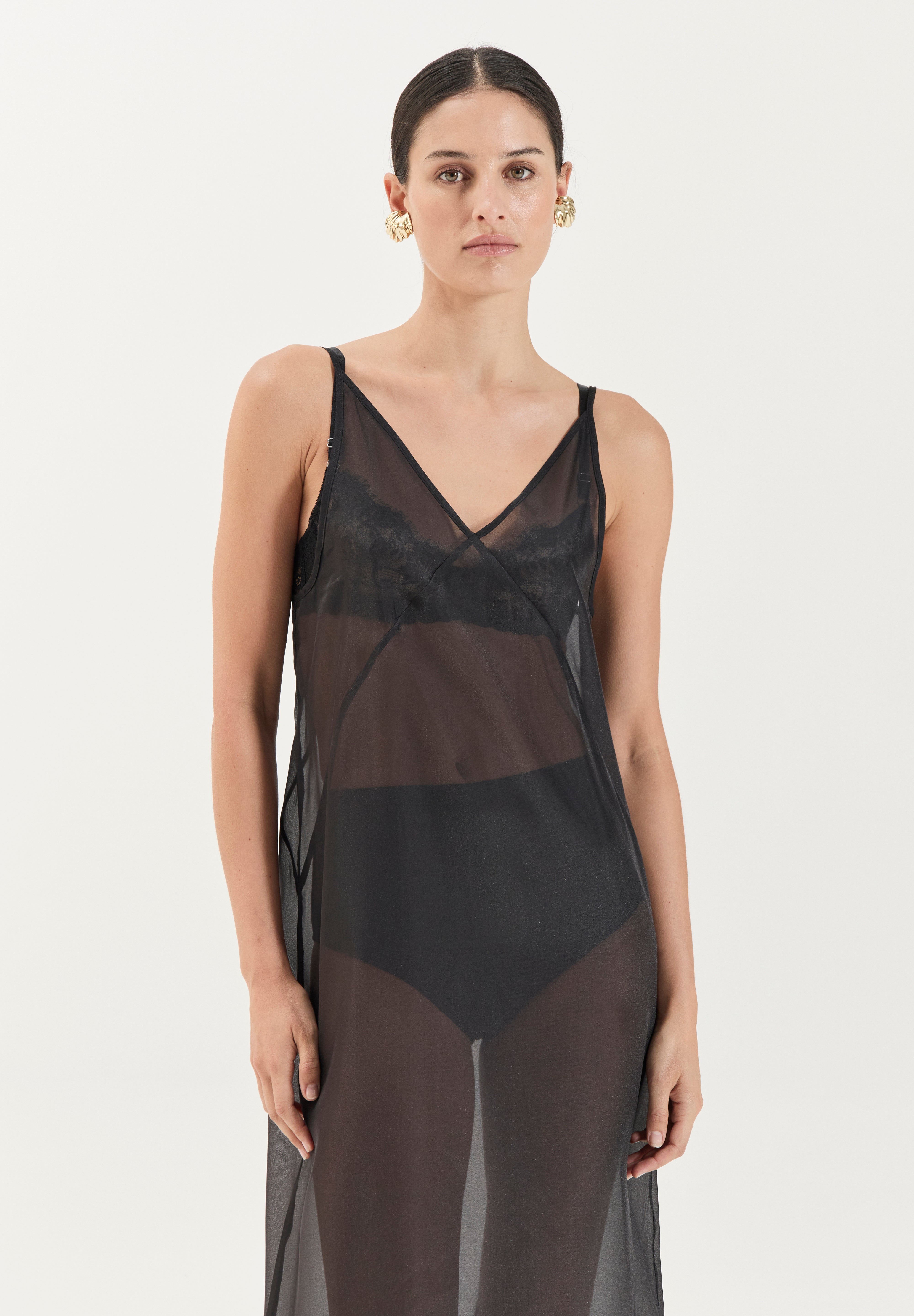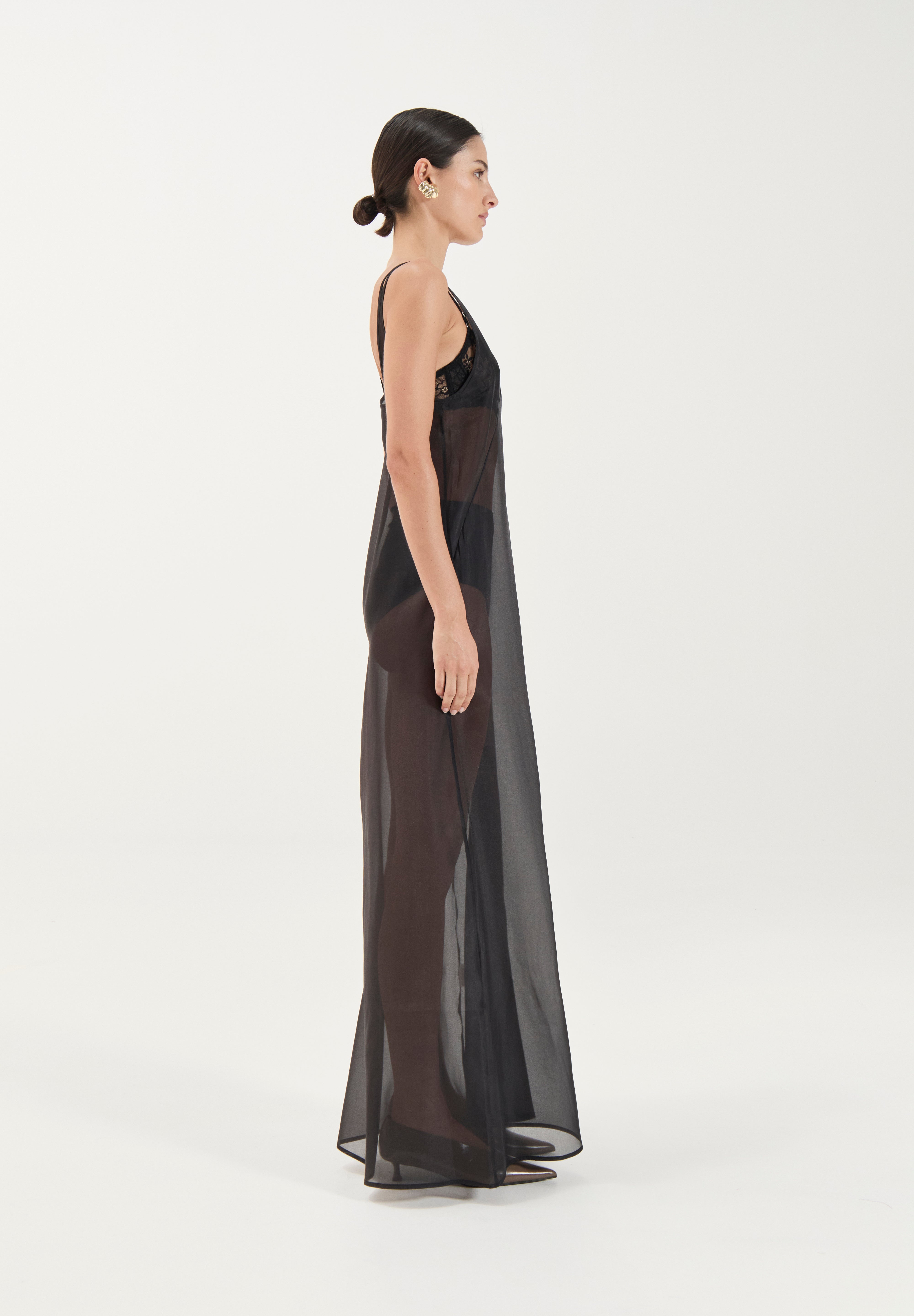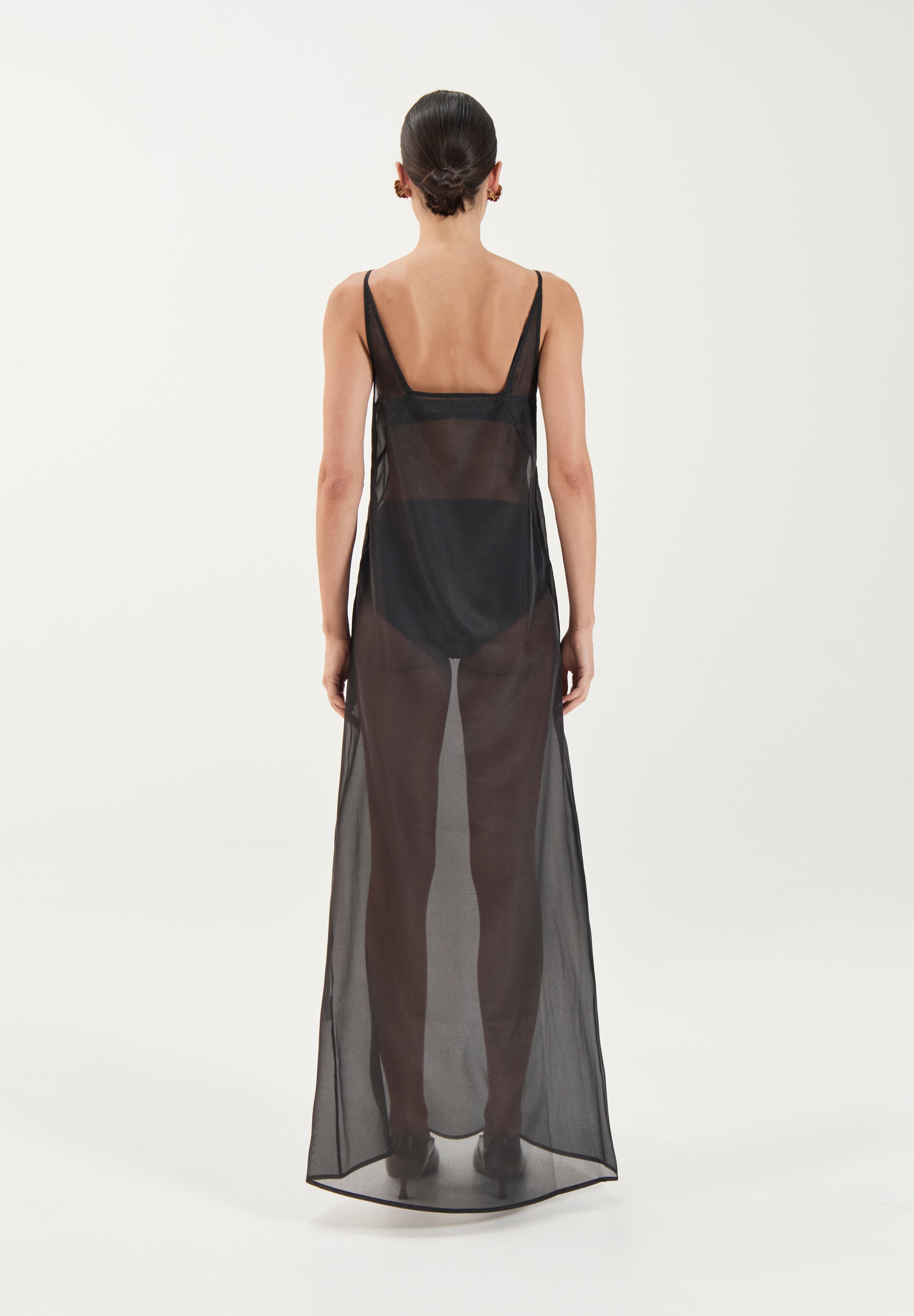 The Georgette dress is crafted from lightweight fabric that skims the body with graceful ease. Featuring a soft V-neckline and fine spaghetti straps, it flows into a floor-length silhouette that enhances its fluidity and movement. The semi-sheer fabrication highlights its modern sensuality, making it a versatile piece for layering or elevated evening dressing.