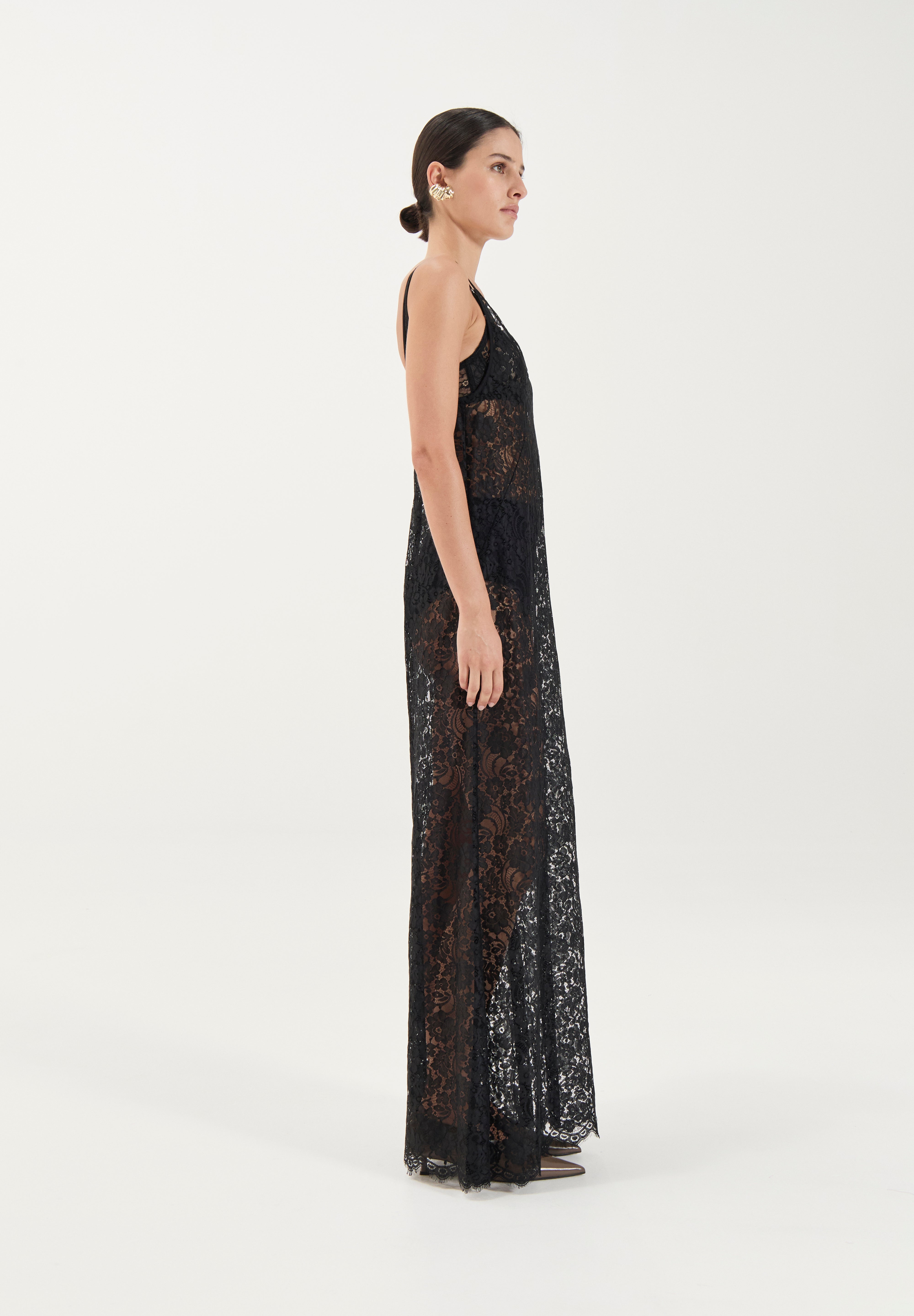 A sheer expression of modern romance, The Georgette Dress is cut in delicate floral lace that skims the body with ease. Featuring a V-neckline and fine spaghetti straps, the design flows into a straight, floor-length silhouette that balances structure with fluidity. The unlined finish highlights the intricate lace patterning, making it a versatile piece for layering or elevated evening-wear.