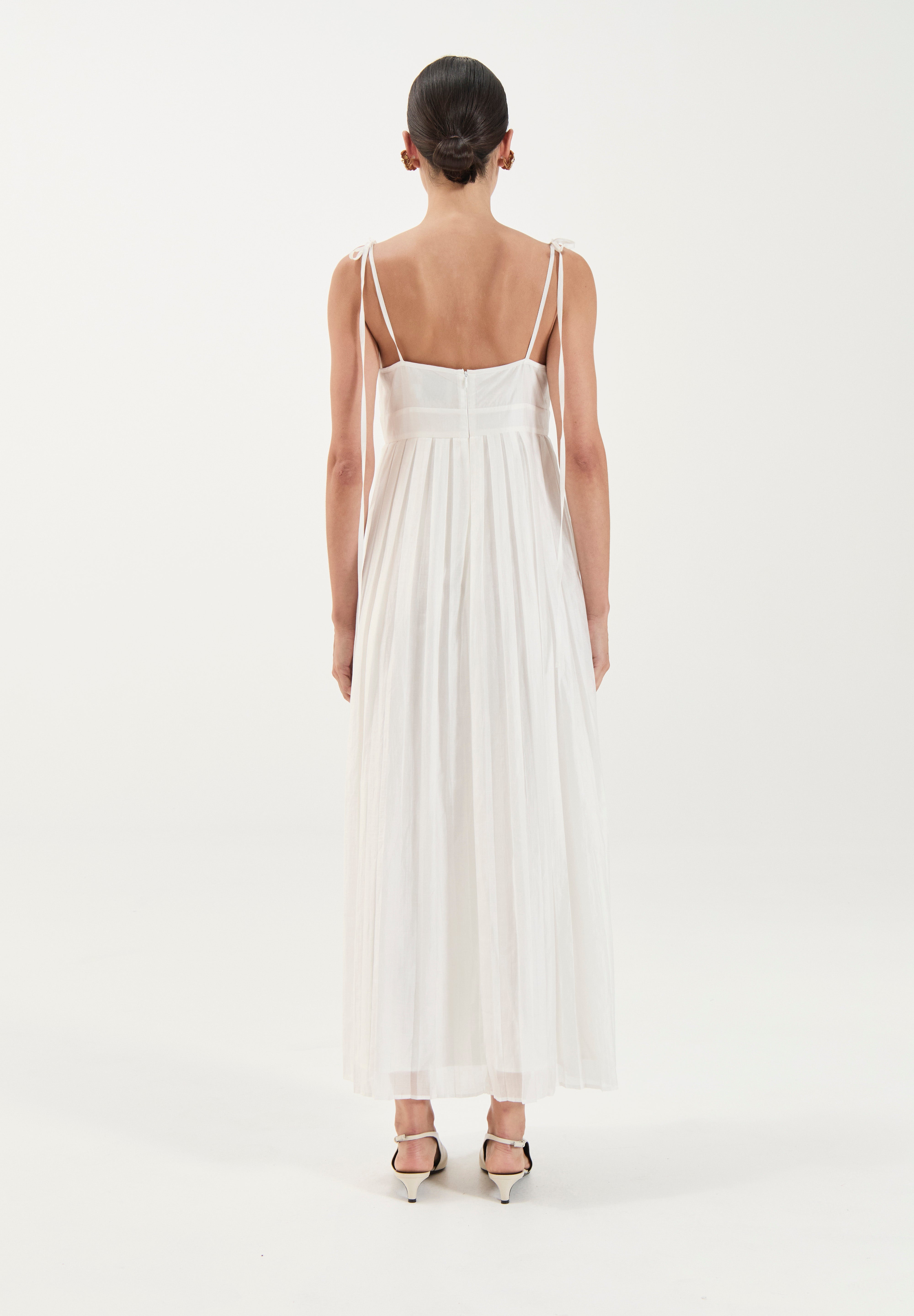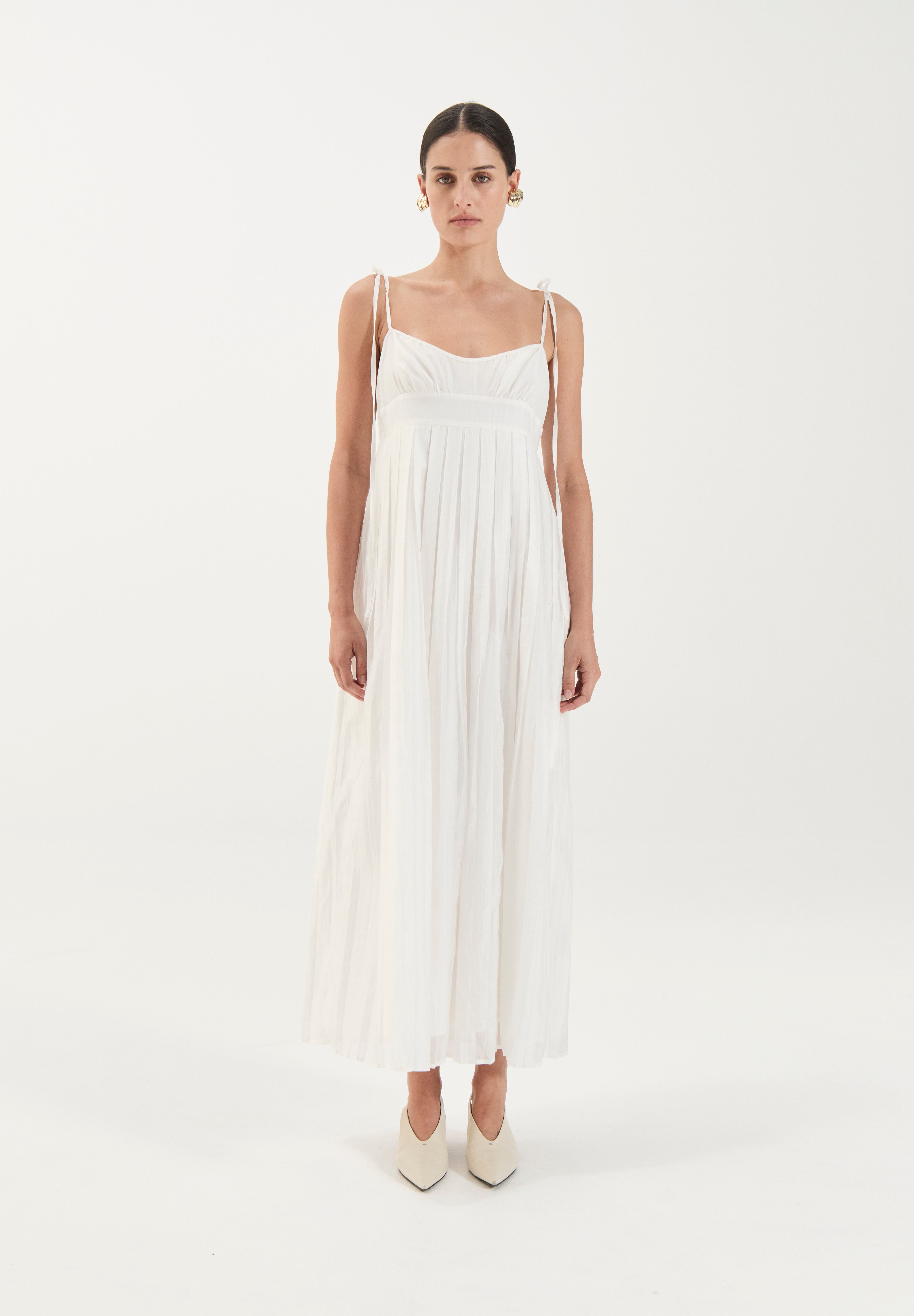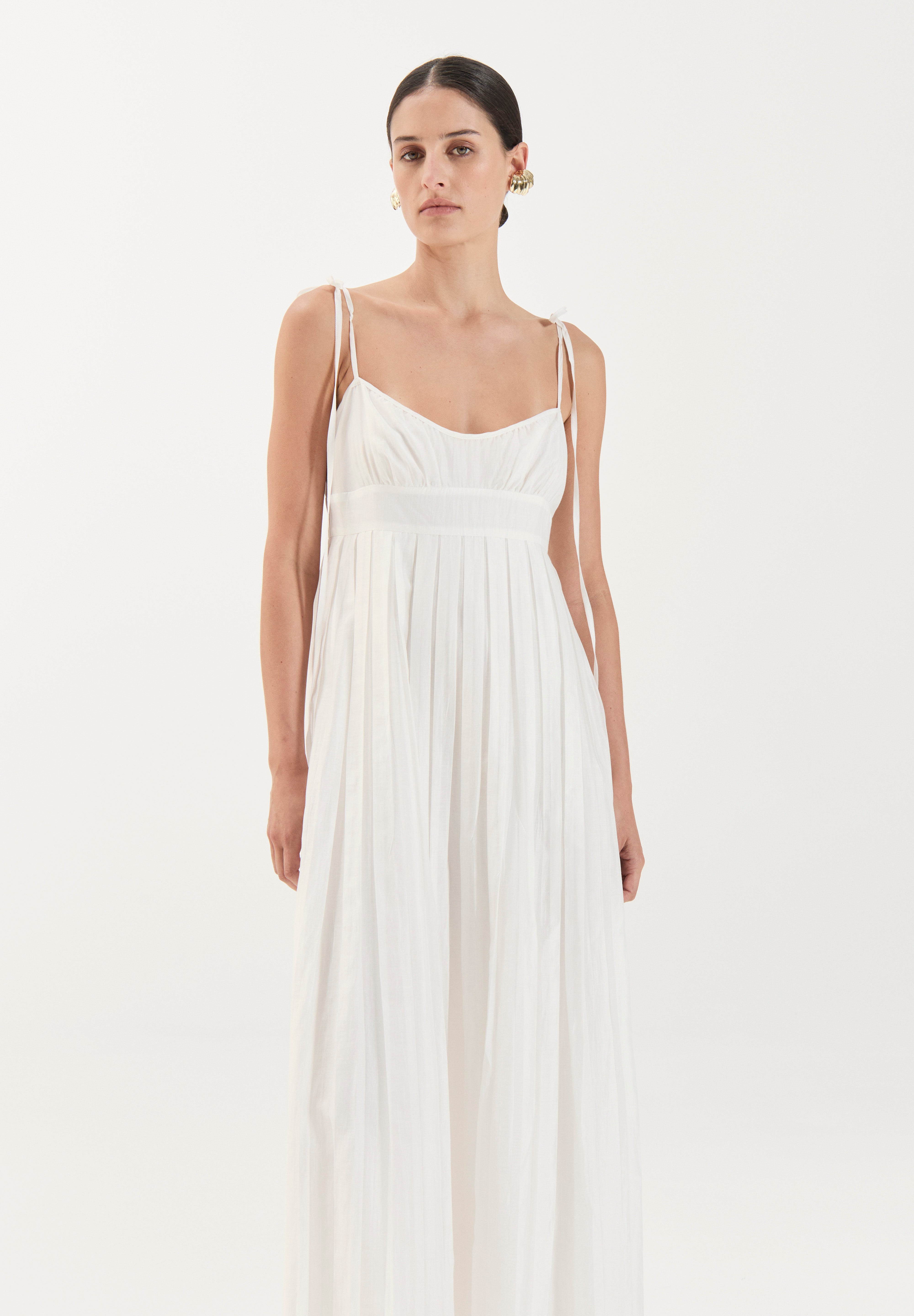 The ethereal full-length Maggie dress captures effortless elegance with a romantic, resort-inspired aesthetic. It features a softly ruched bust with a subtle sweetheart neckline and delicate self-tie spaghetti straps. The bodice is gently fitted and flows into a high waistline, from which the skirt falls in soft, gathered pleats creating movement and ease.