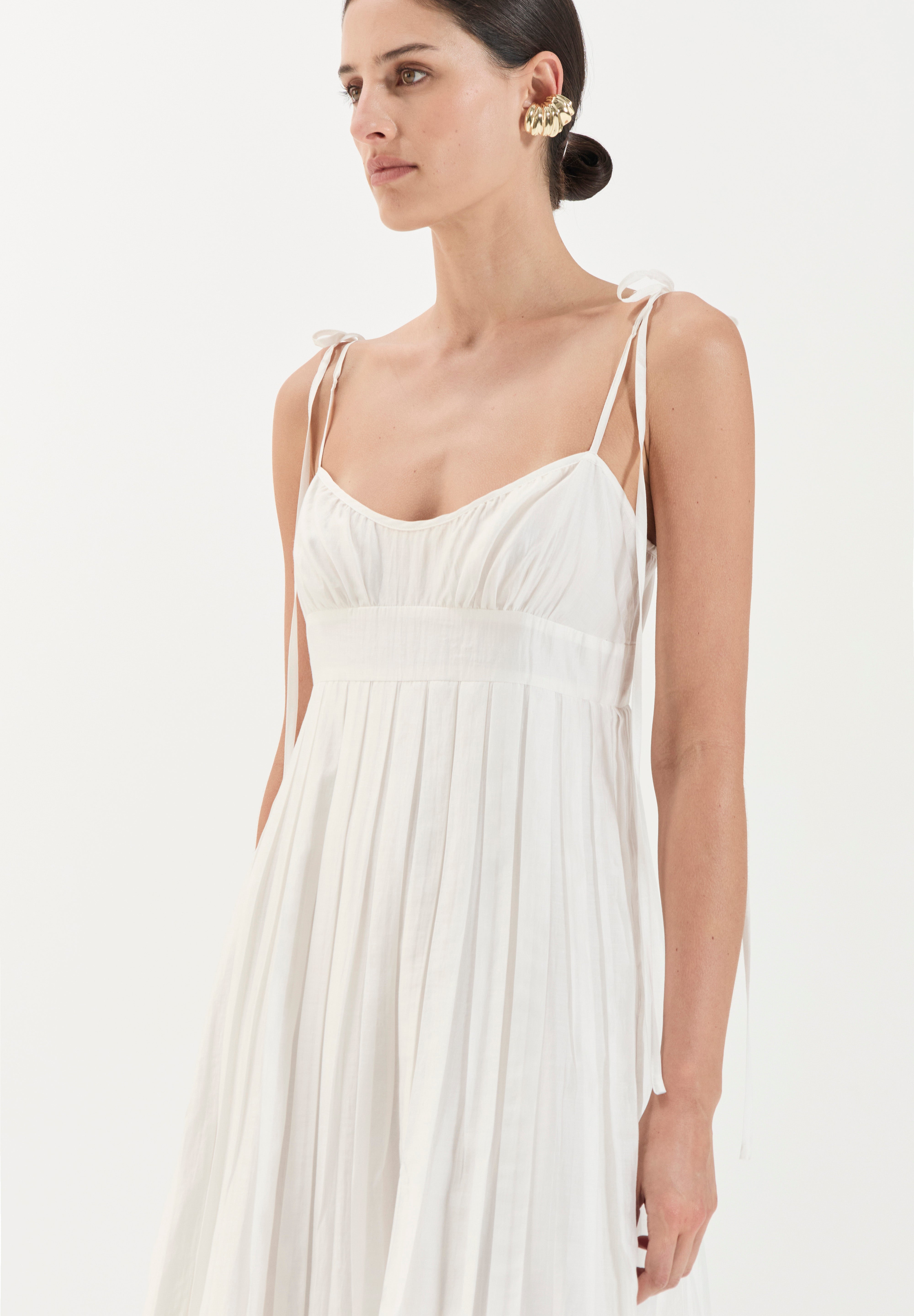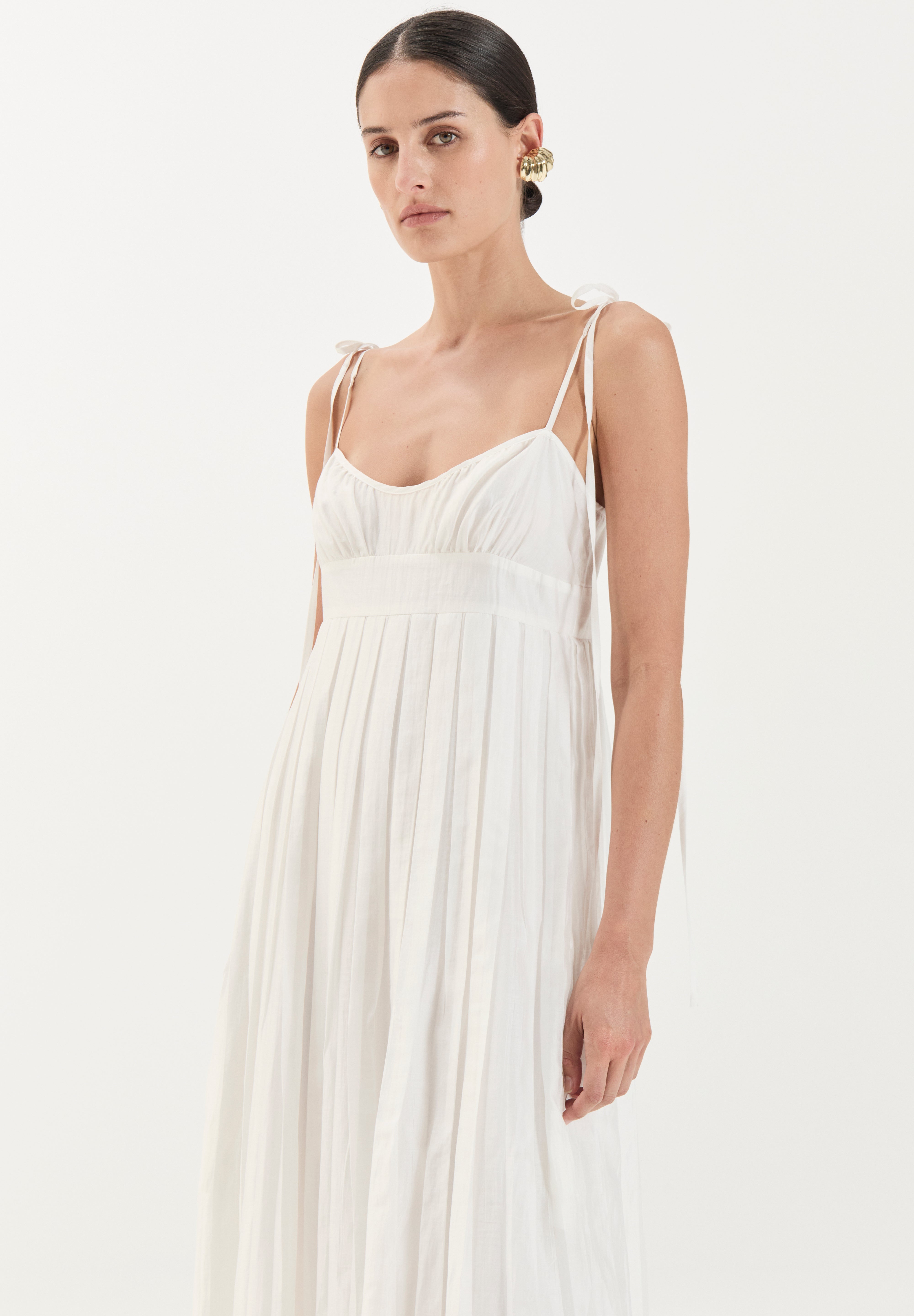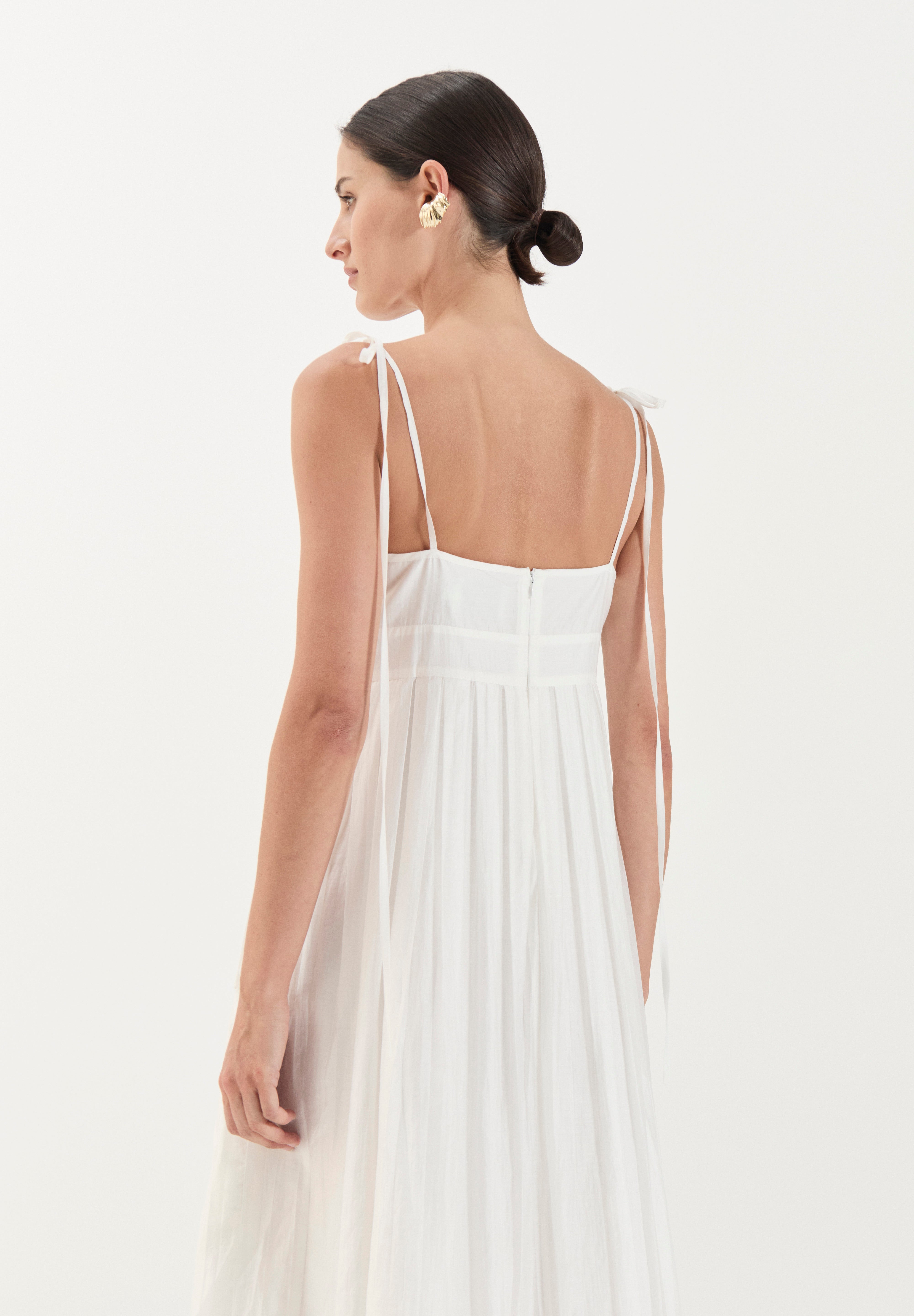 The ethereal full-length Maggie dress captures effortless elegance with a romantic, resort-inspired aesthetic. It features a softly ruched bust with a subtle sweetheart neckline and delicate self-tie spaghetti straps. The bodice is gently fitted and flows into a high waistline, from which the skirt falls in soft, gathered pleats creating movement and ease.