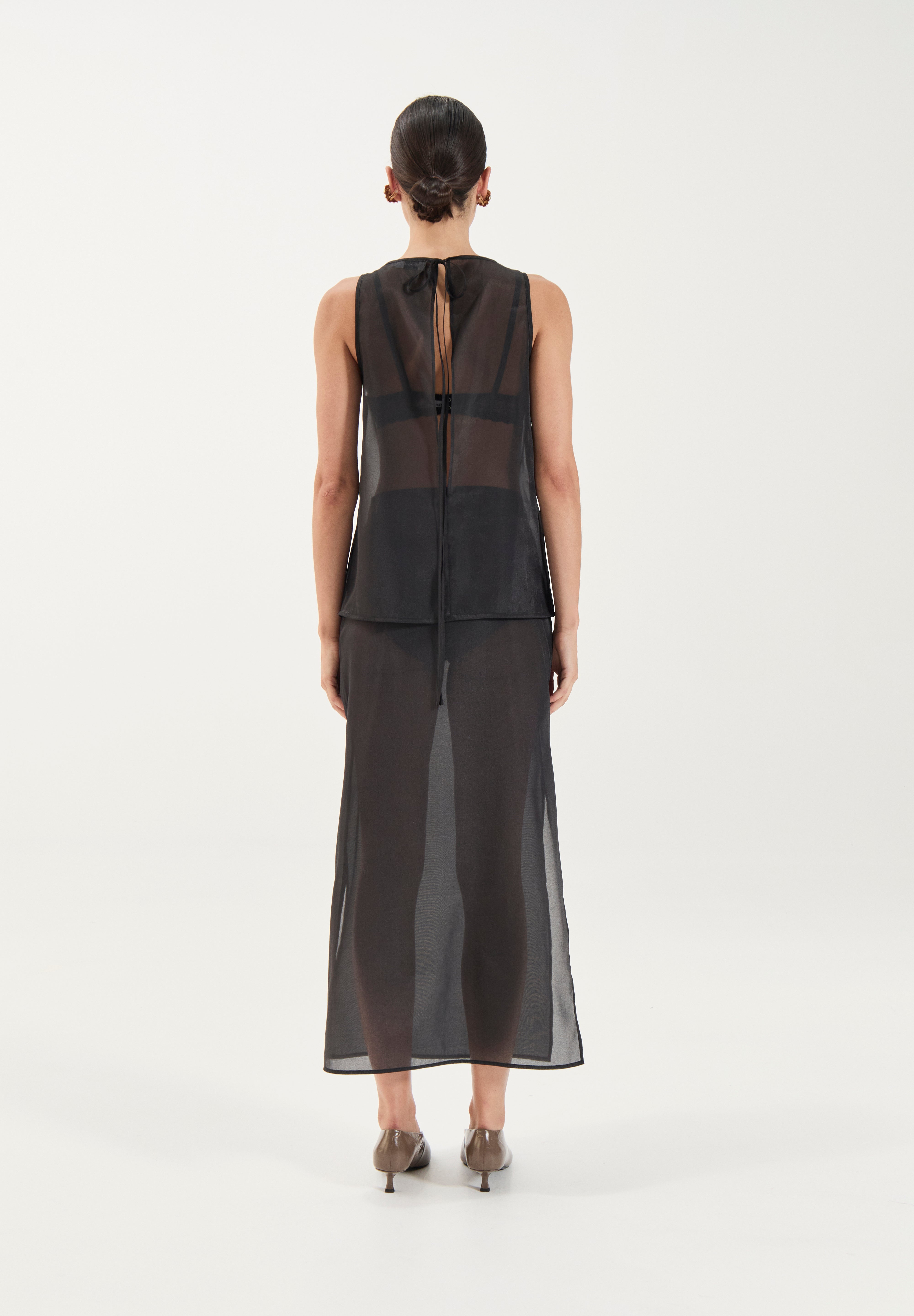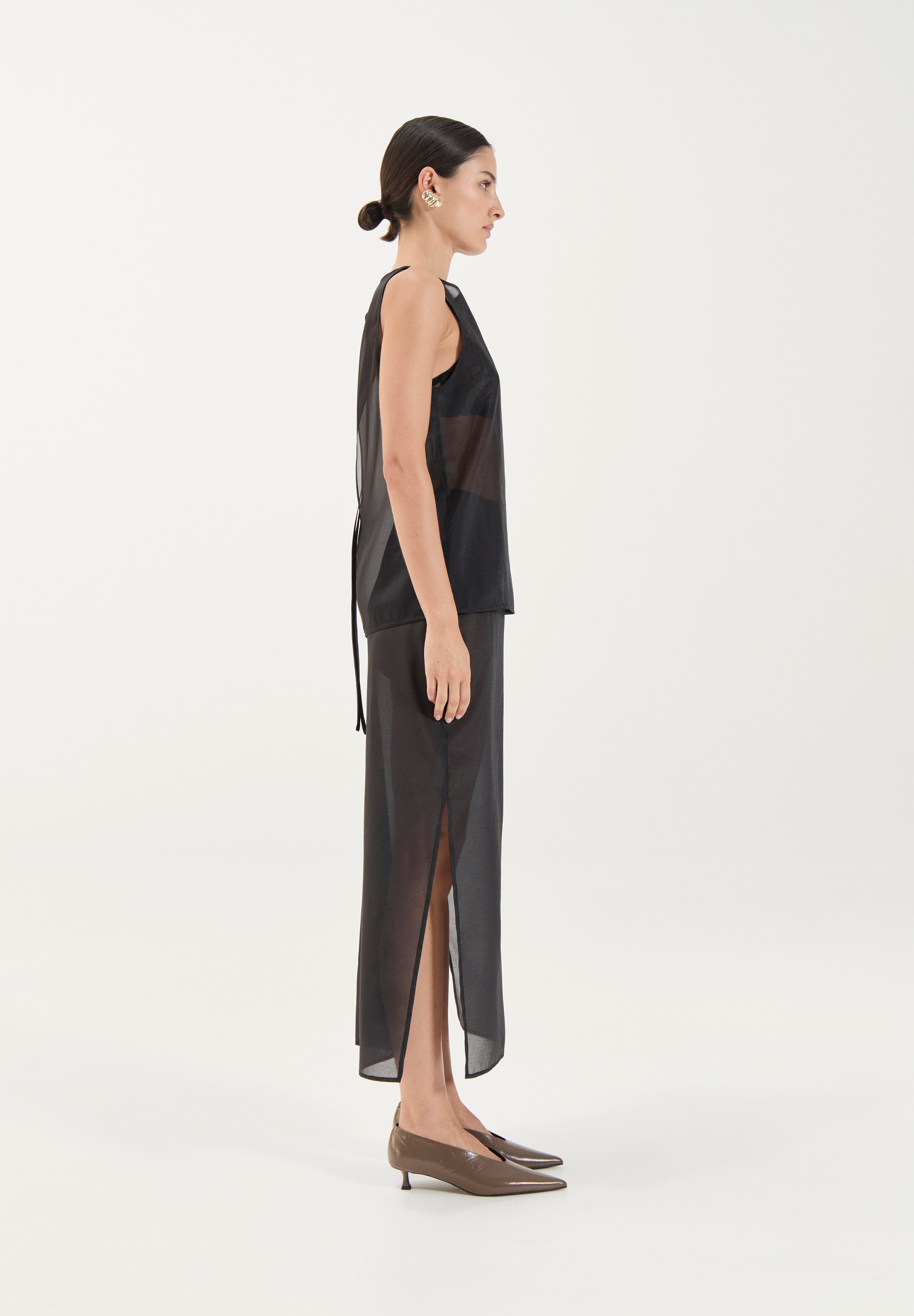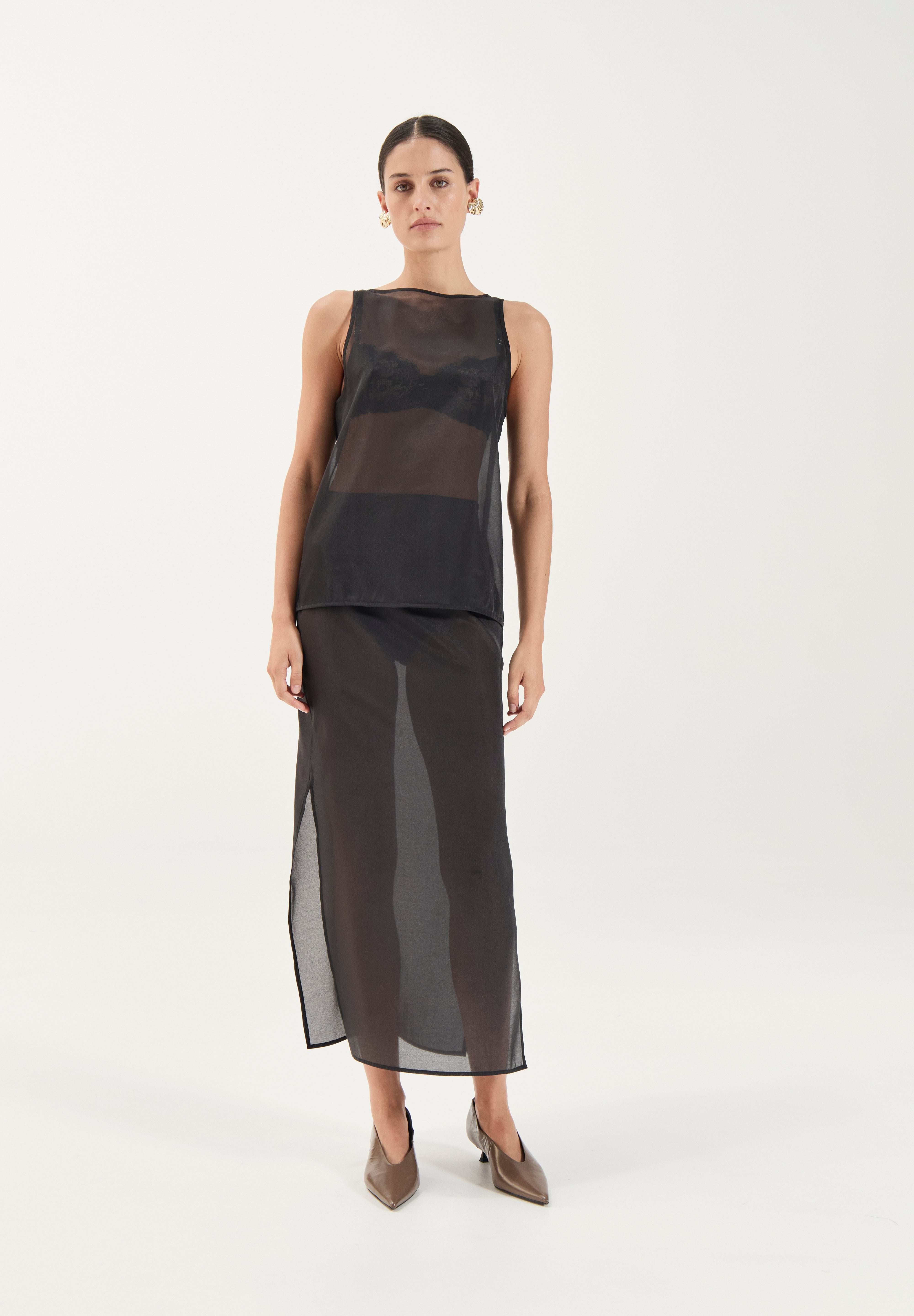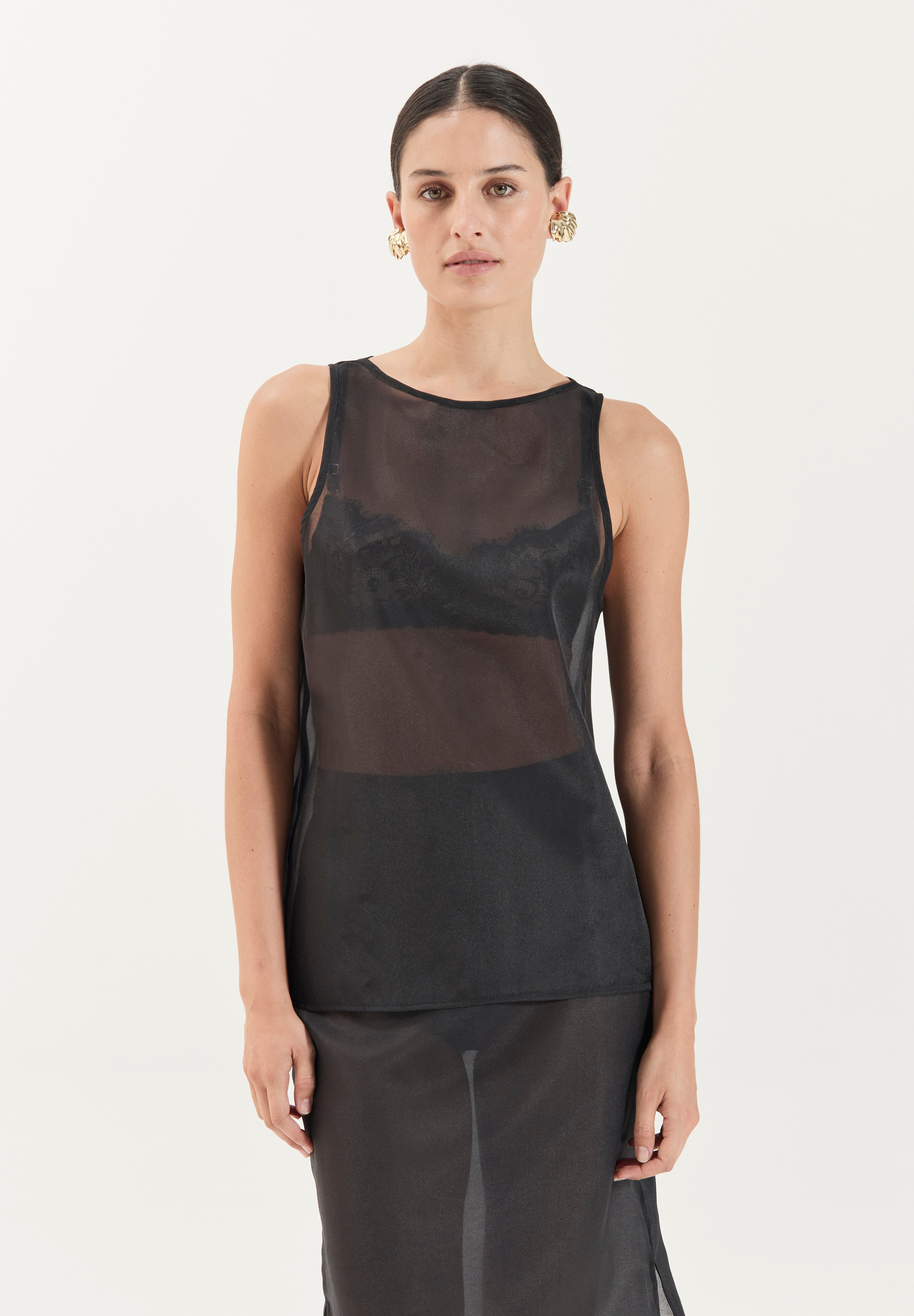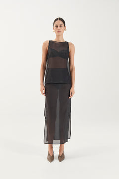 Modelled after our best selling Aurora Tunic, comes The Aurora Top. Cropped to perfection, The Aurora Top is crafted from a soft sheer organza that drapes beautifully over the body. The clean boat neckline and straight silhouette create a modern, understated shape, while the translucent finish makes it a versatile layering piece for both day and evening styling.