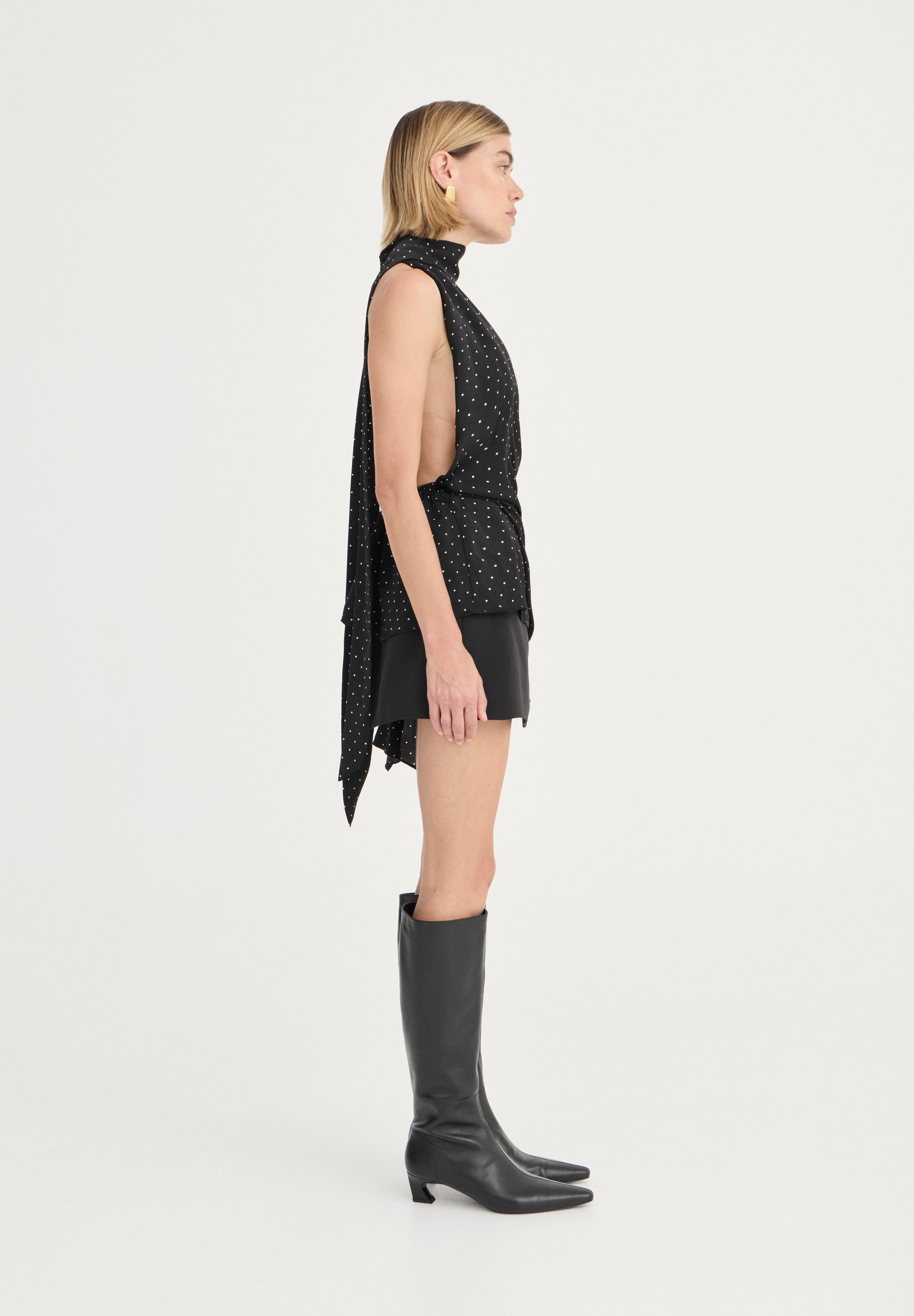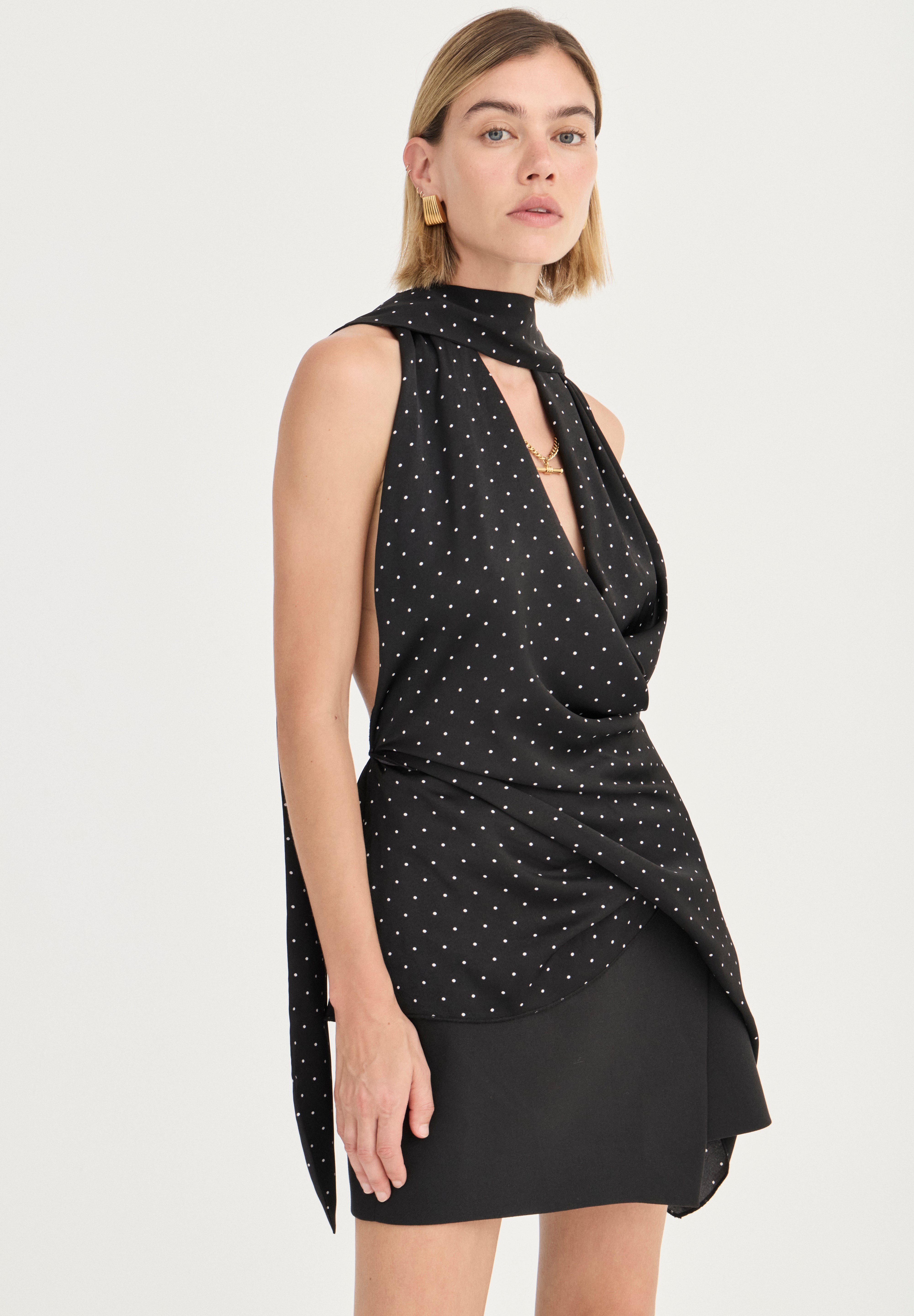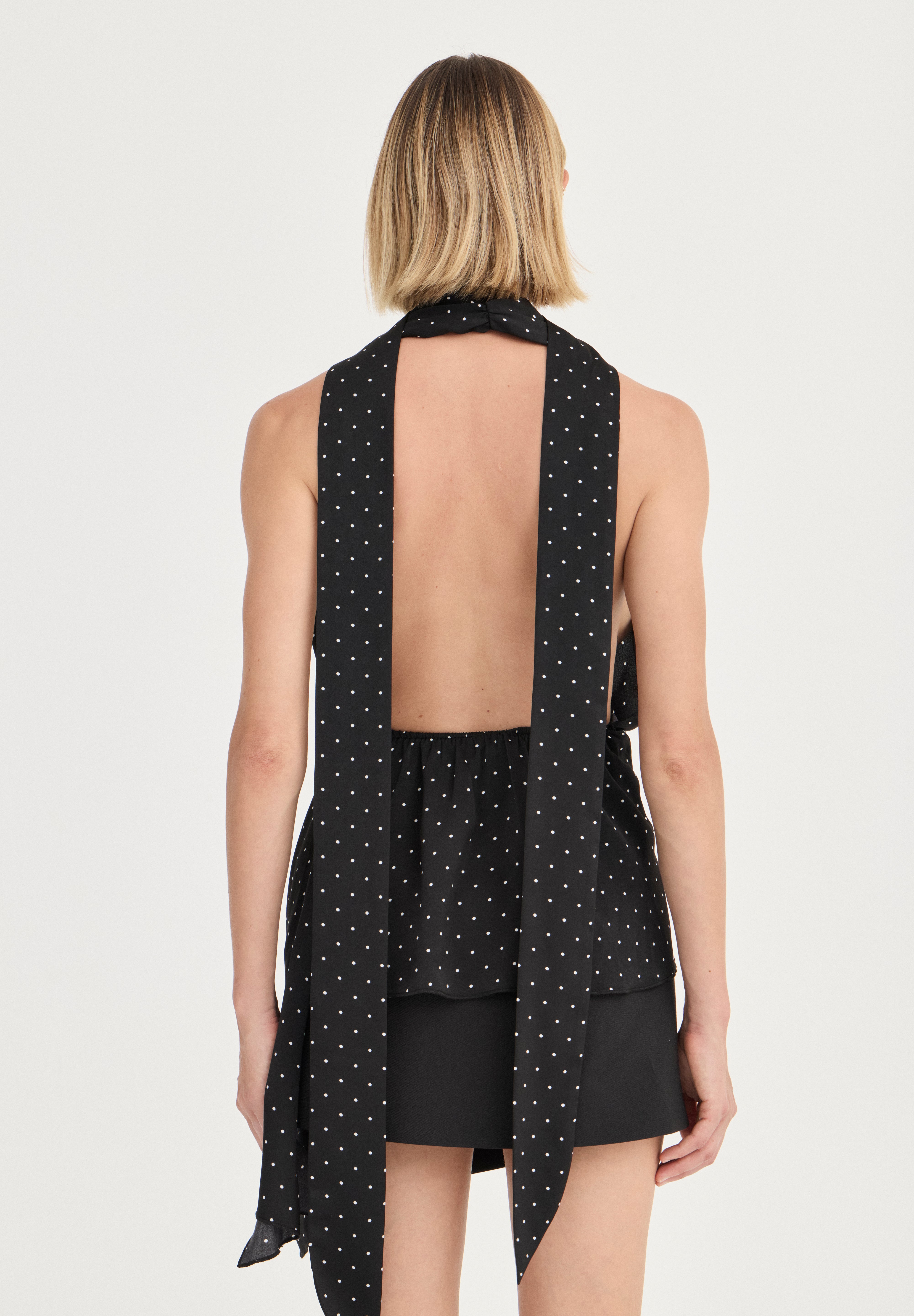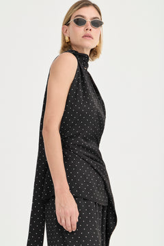 The Antonella Top is cut from our exclusive fluid-like satin fabric with a delicate polka-dot finish. Designed with a deep V neckline and a wrap-style front, the silhouette skims the body before falling into an asymmetric, scarf-like overlay that moves beautifully with each step. Open through the shoulders and back, it balances ease and elegance—effortless by day, elevated by night.