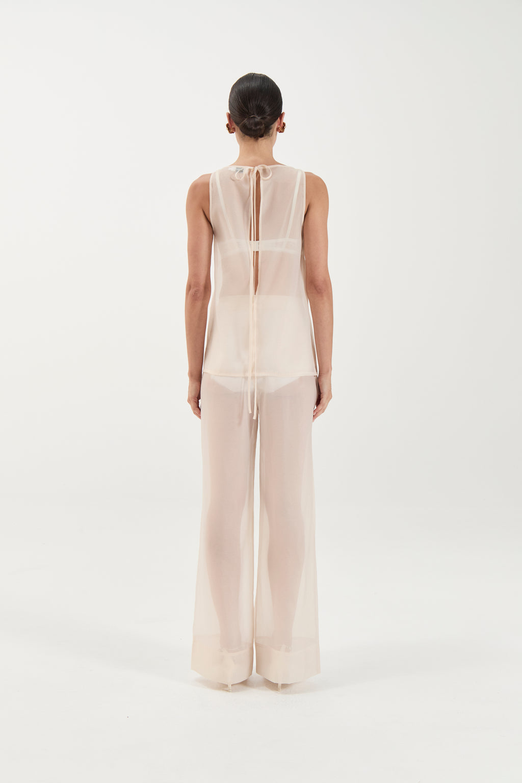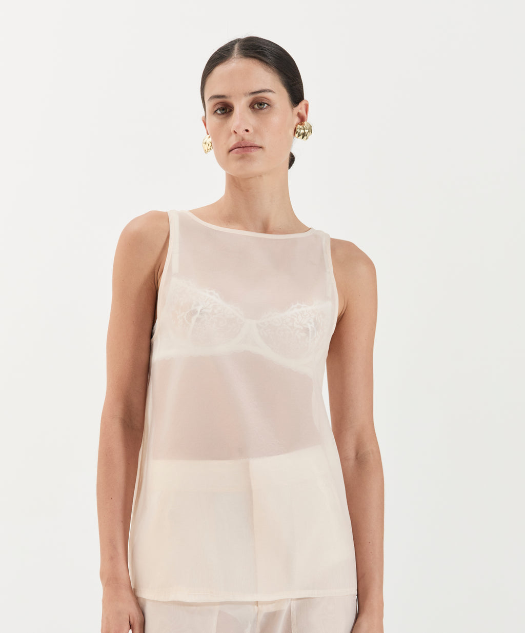 Modelled after our best selling Aurora Tunic, comes The Aurora Top. Cropped to perfection, The Aurora Top is crafted from a soft sheer organza that drapes beautifully over the body. The clean boat neckline and straight silhouette create a modern, understated shape, while the translucent finish makes it a versatile layering piece for both day and evening styling.