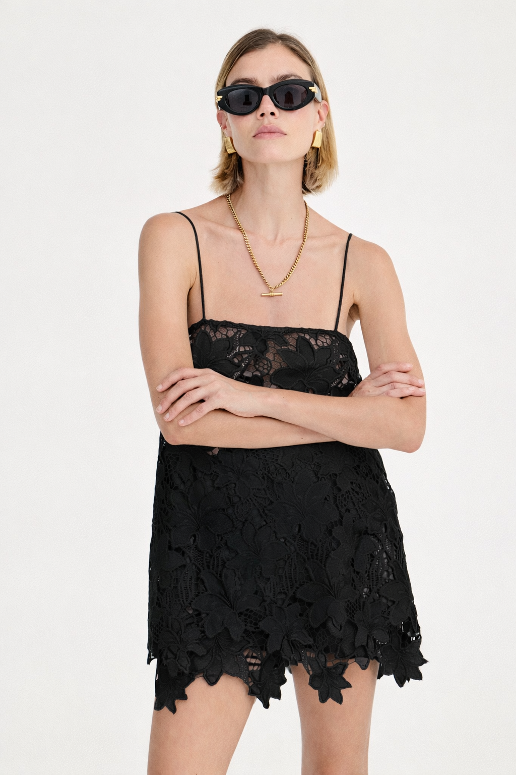 The Camilla lace mini dress is crafted in delicate floral lace with a fluid, mini silhouette. Designed with fine spaghetti straps and a straight neckline, it drapes effortlessly over the upper body, offering a refined balance of structure and transparency. Pair with The Bonnie Shorts or Zara Pants for a complete look.
