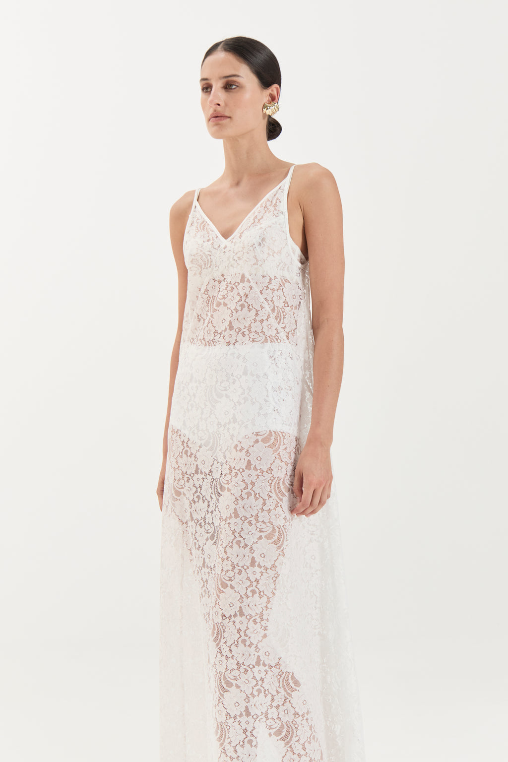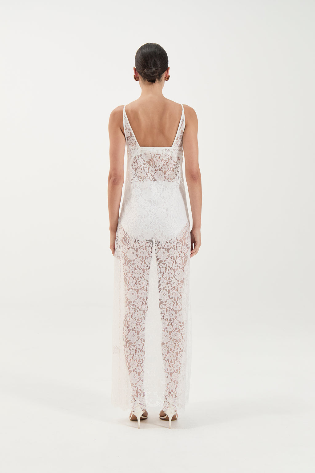 A sheer expression of modern romance, The Georgette Dress is cut in delicate floral lace that skims the body with ease. Featuring a V-neckline and fine spaghetti straps, the design flows into a straight, floor-length silhouette that balances structure with fluidity. The unlined finish highlights the intricate lace patterning, making it a versatile piece for layering or elevated eveningwear.