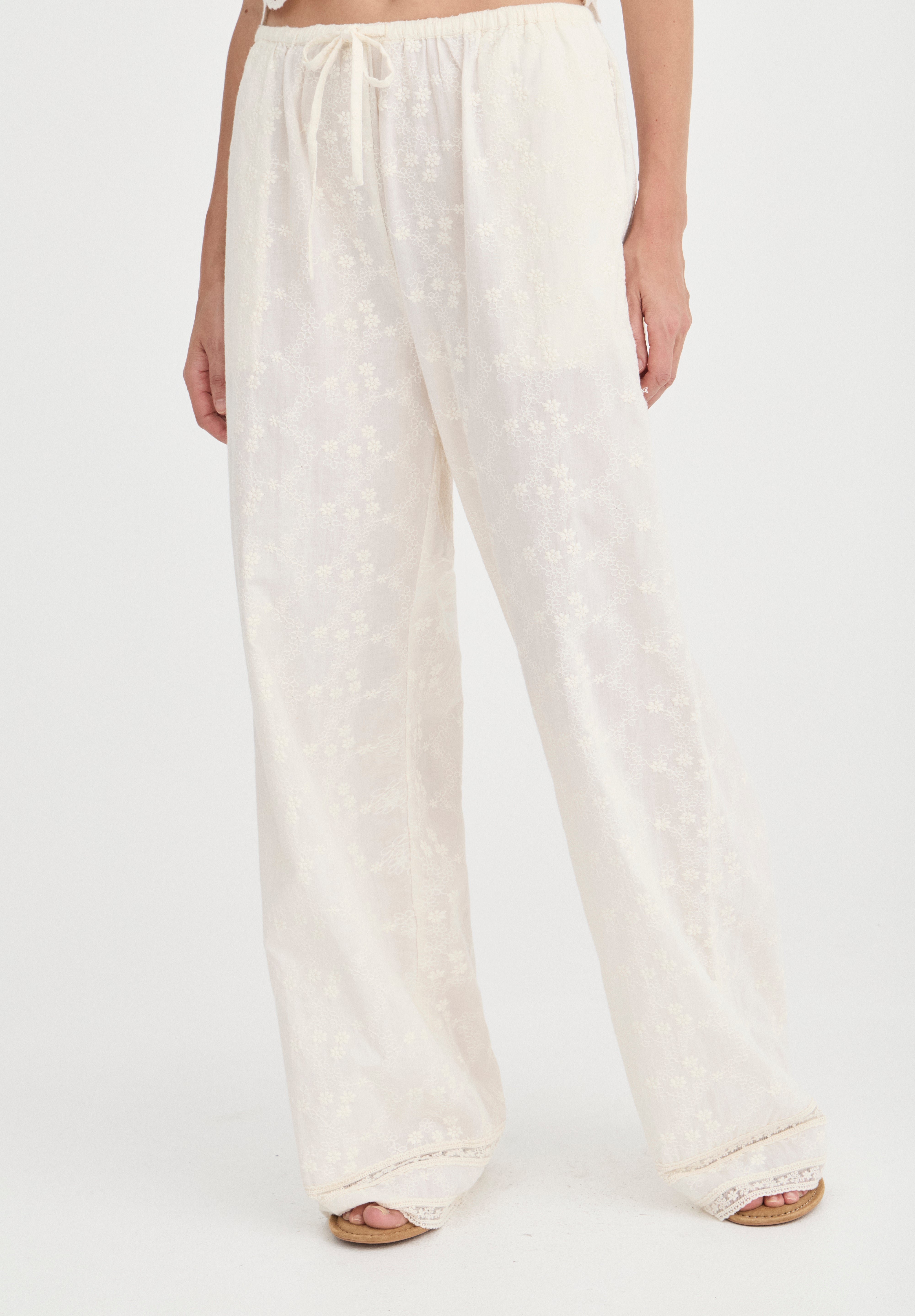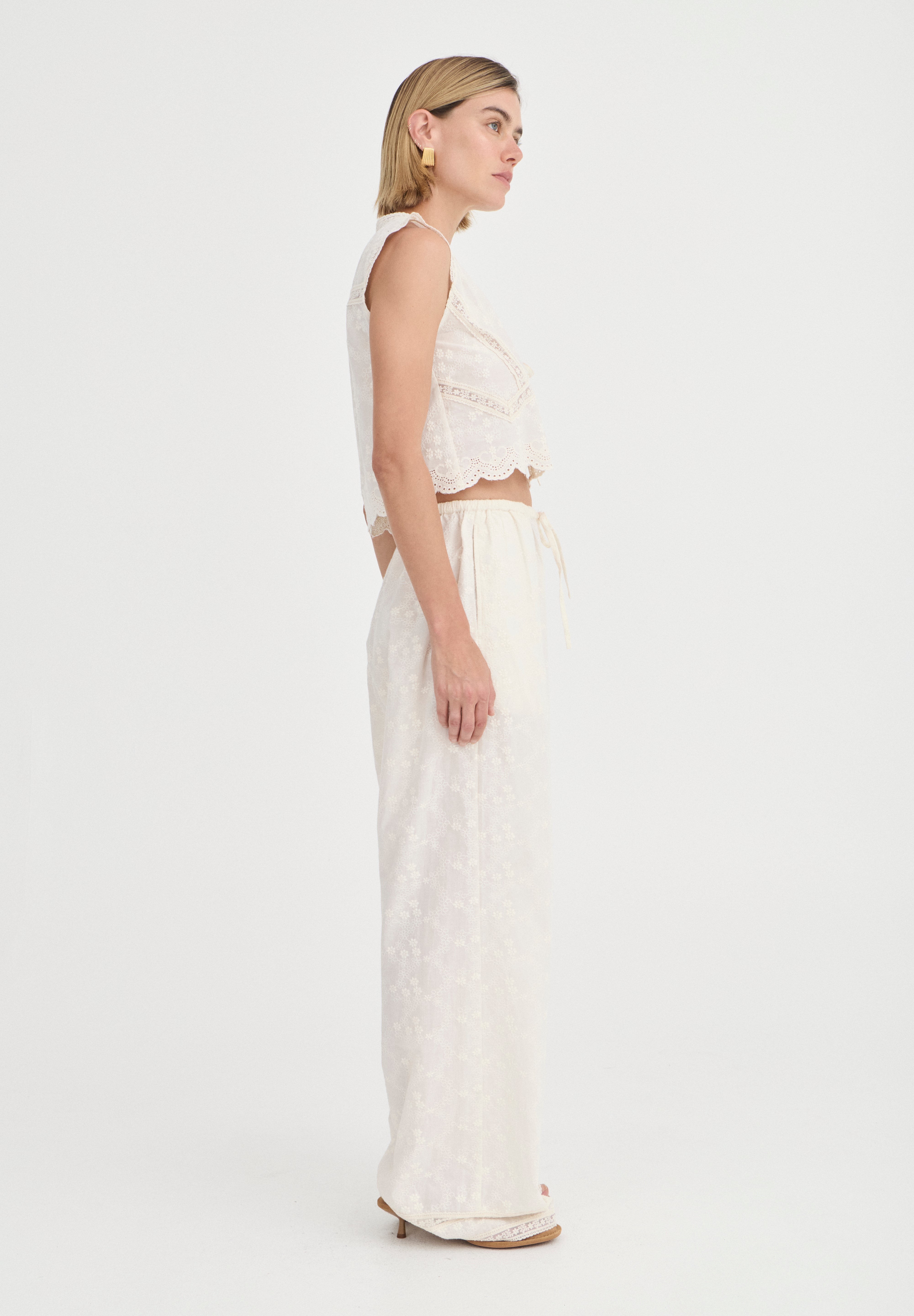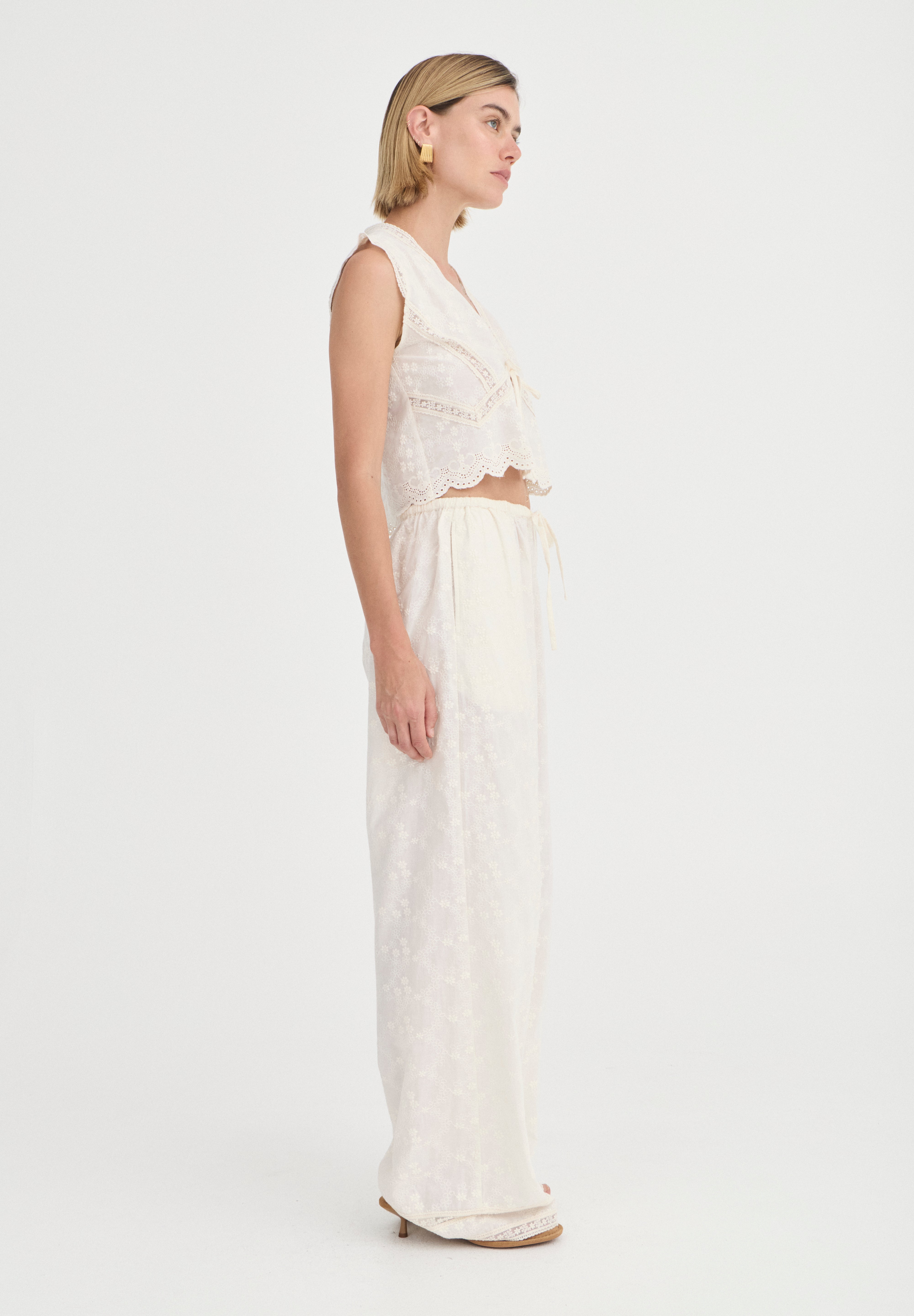 Designed for effortless elegance, The Giulia Pants are crafted from delicate embroidered cotton with a soft, fluid drape. Sitting comfortably at the waist, they feature an elasticated waistband with a subtle drawstring for ease and adjustability.