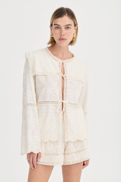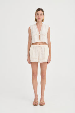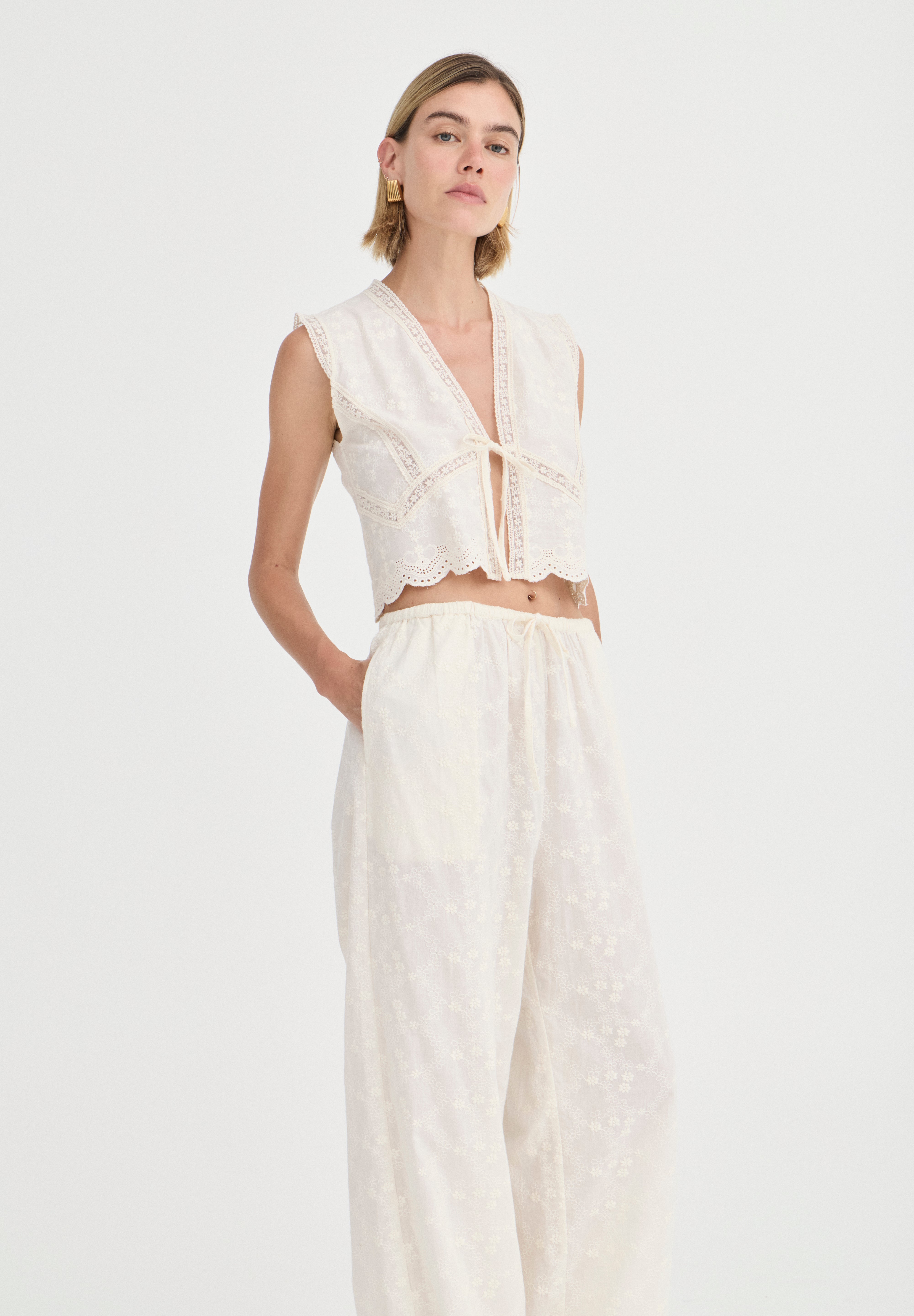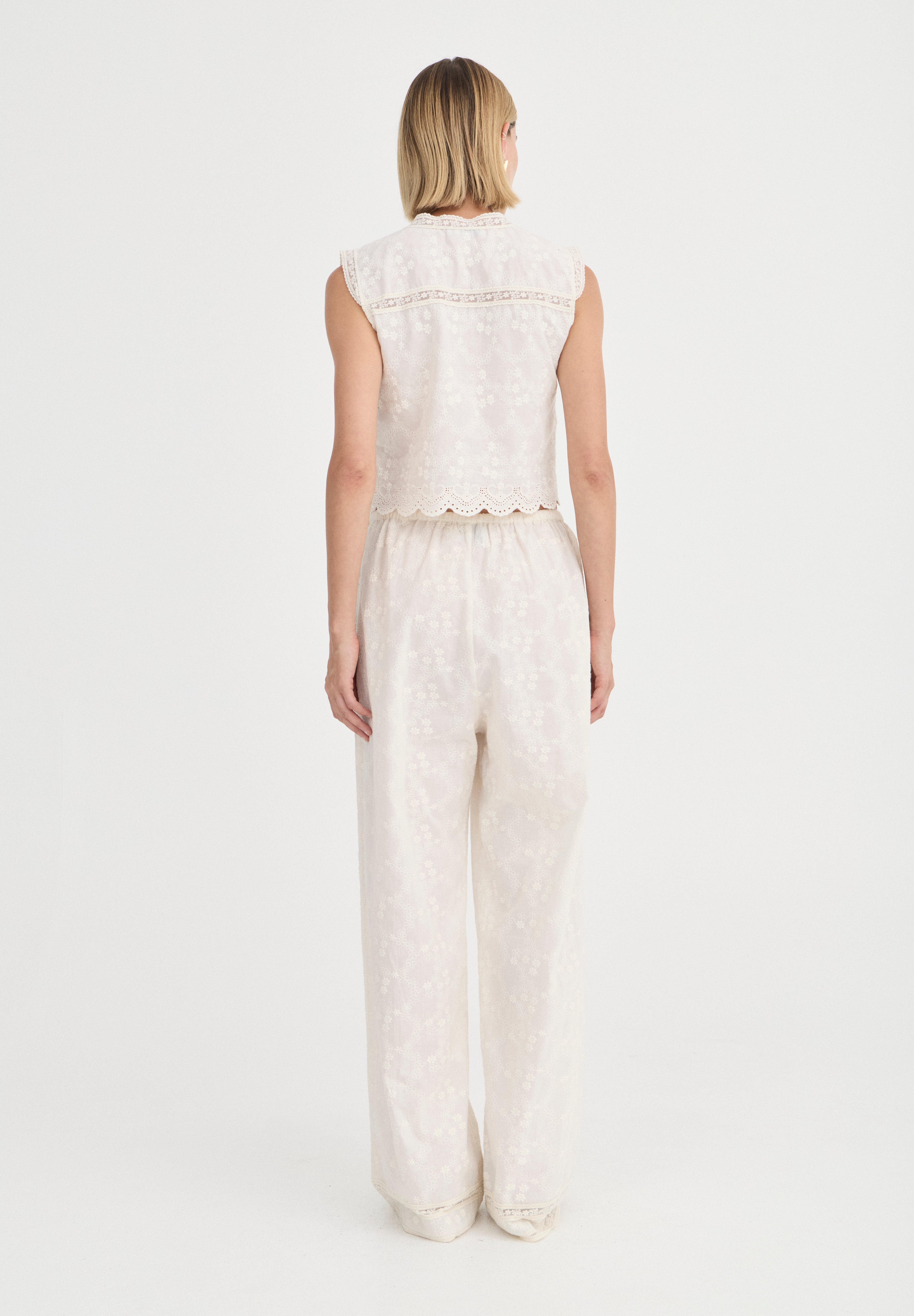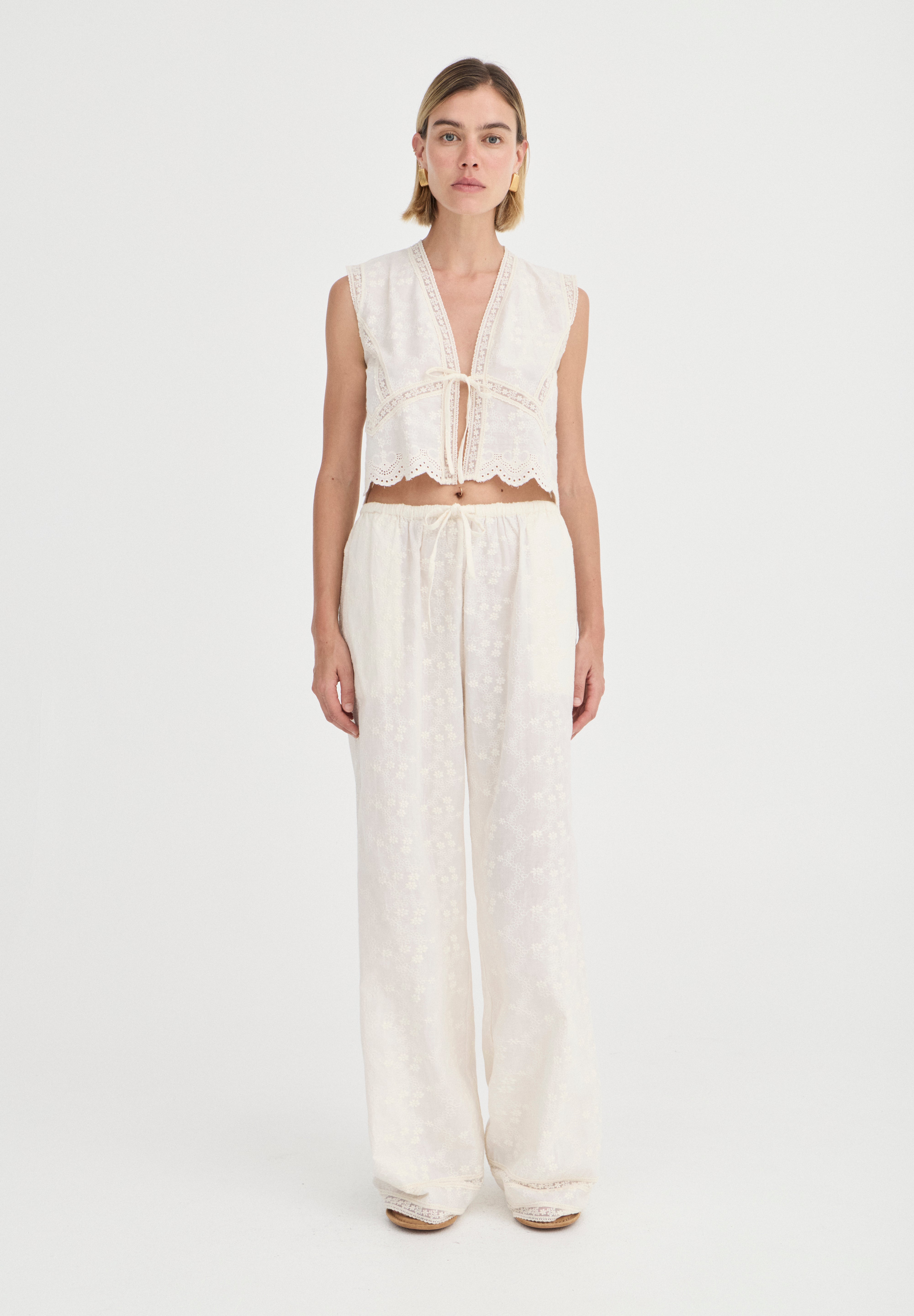 Designed for effortless elegance, The Giulia Pants are crafted from delicate embroidered cotton with a soft, fluid drape. Sitting comfortably at the waist, they feature an elasticated waistband with a subtle drawstring for ease and adjustability.