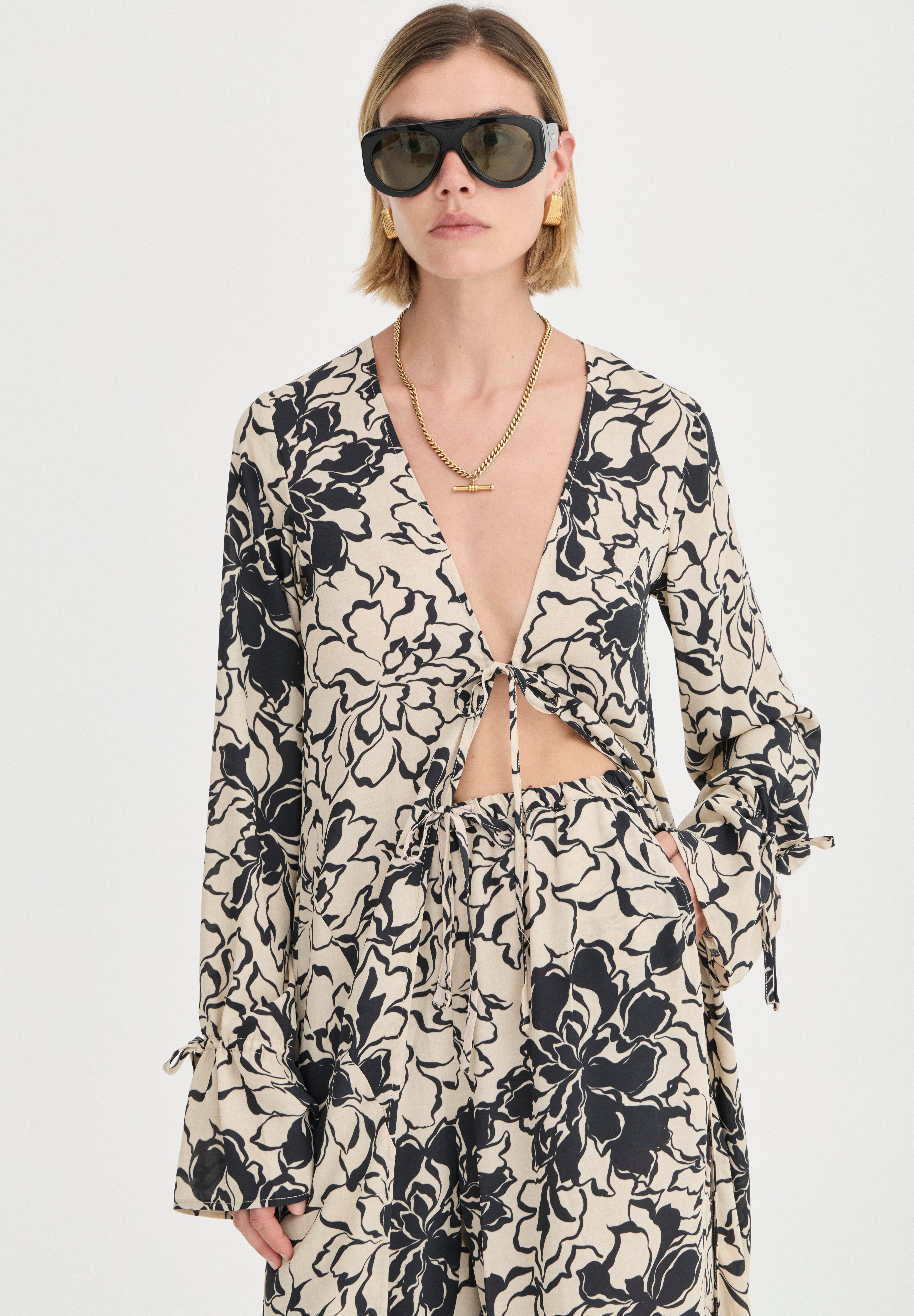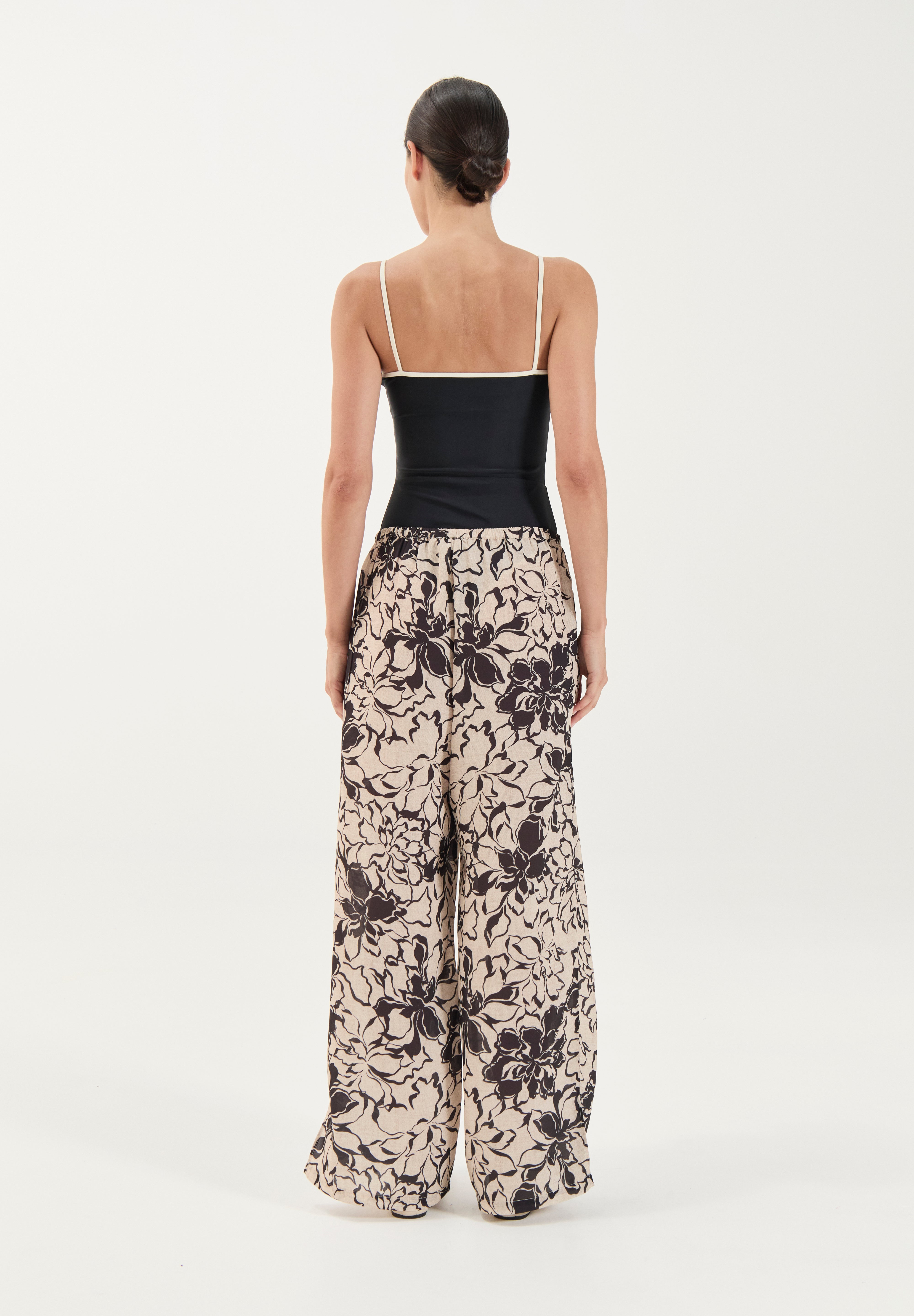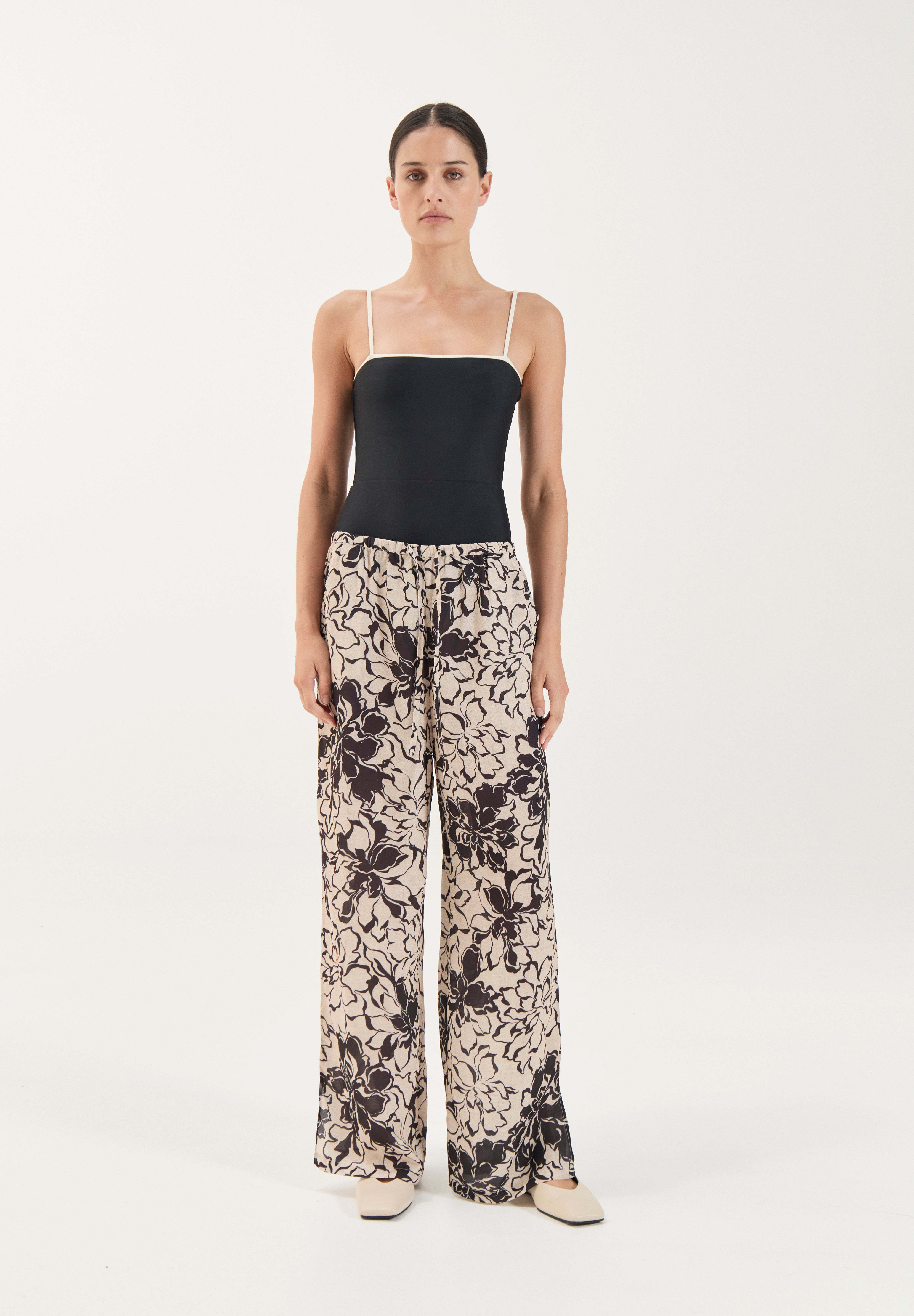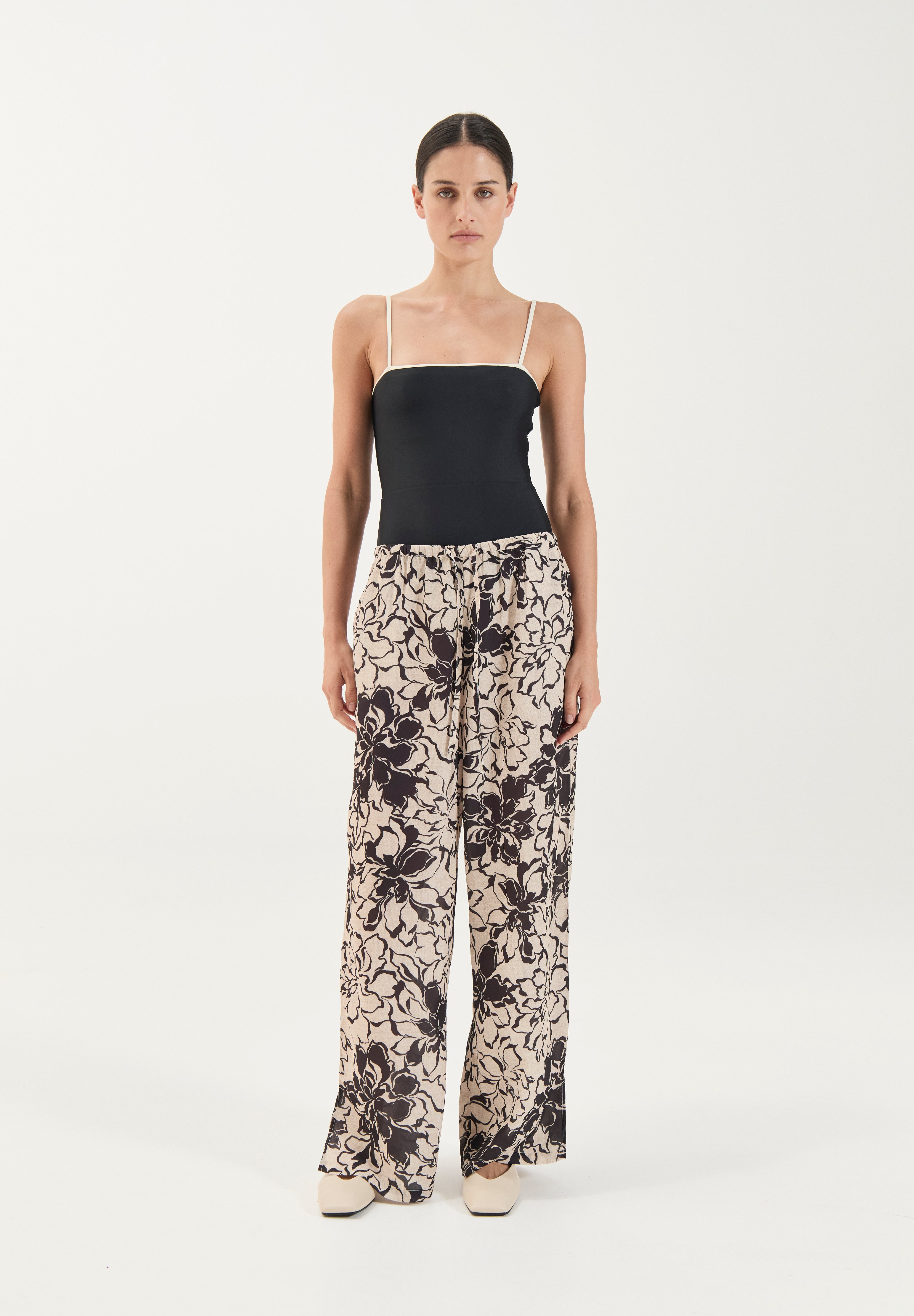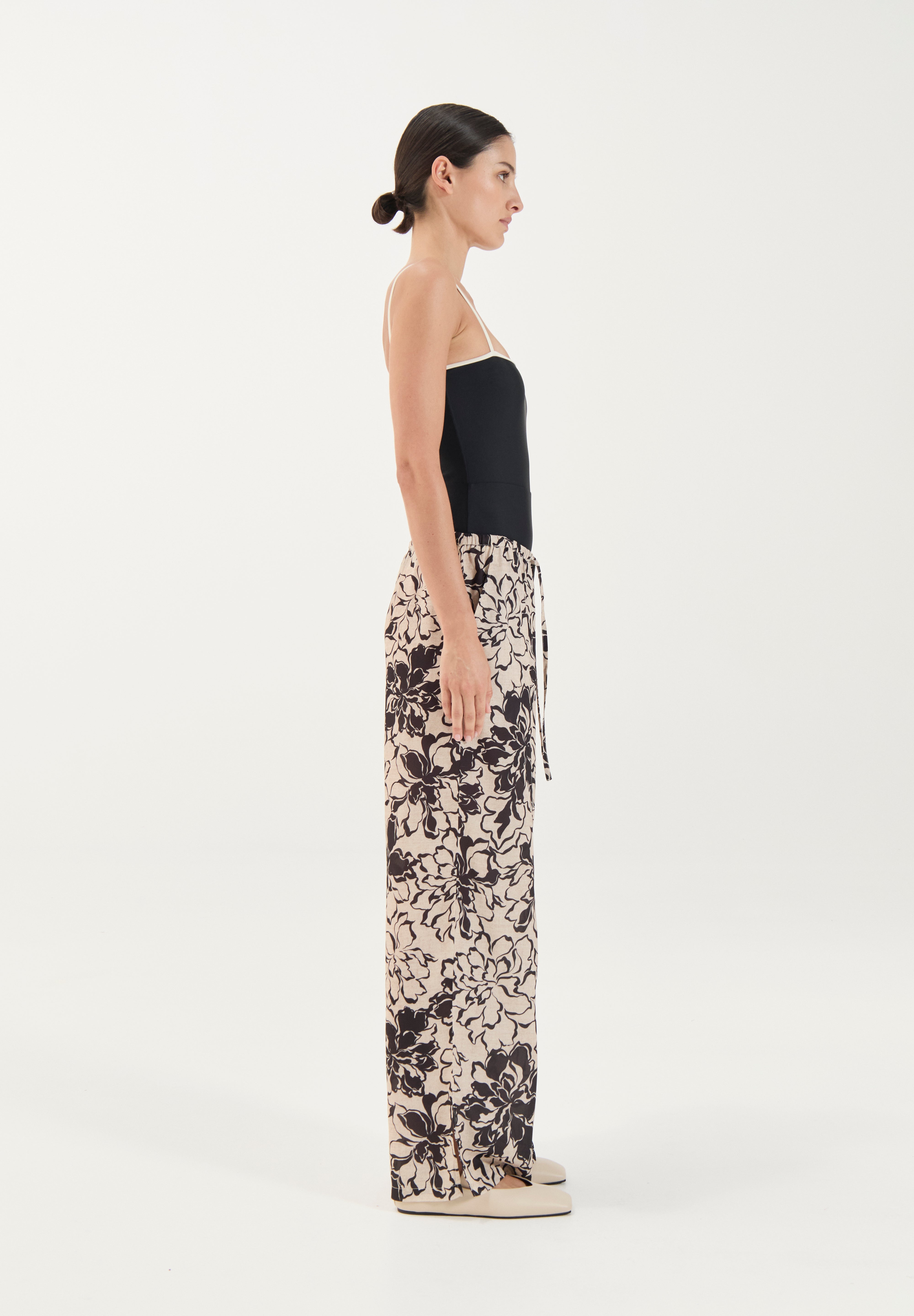 The Giulia Pants in Silk feature an all-over floral print in warm neutral tones that evoke an elevated resort aesthetic. Cut from lightweight, softly draping silk, they offer a relaxed yet elegant silhouette with a comfortable drawstring waistband for an adjustable fit. The full-length design elongates the frame, while the airy construction moves beautifully with each step.